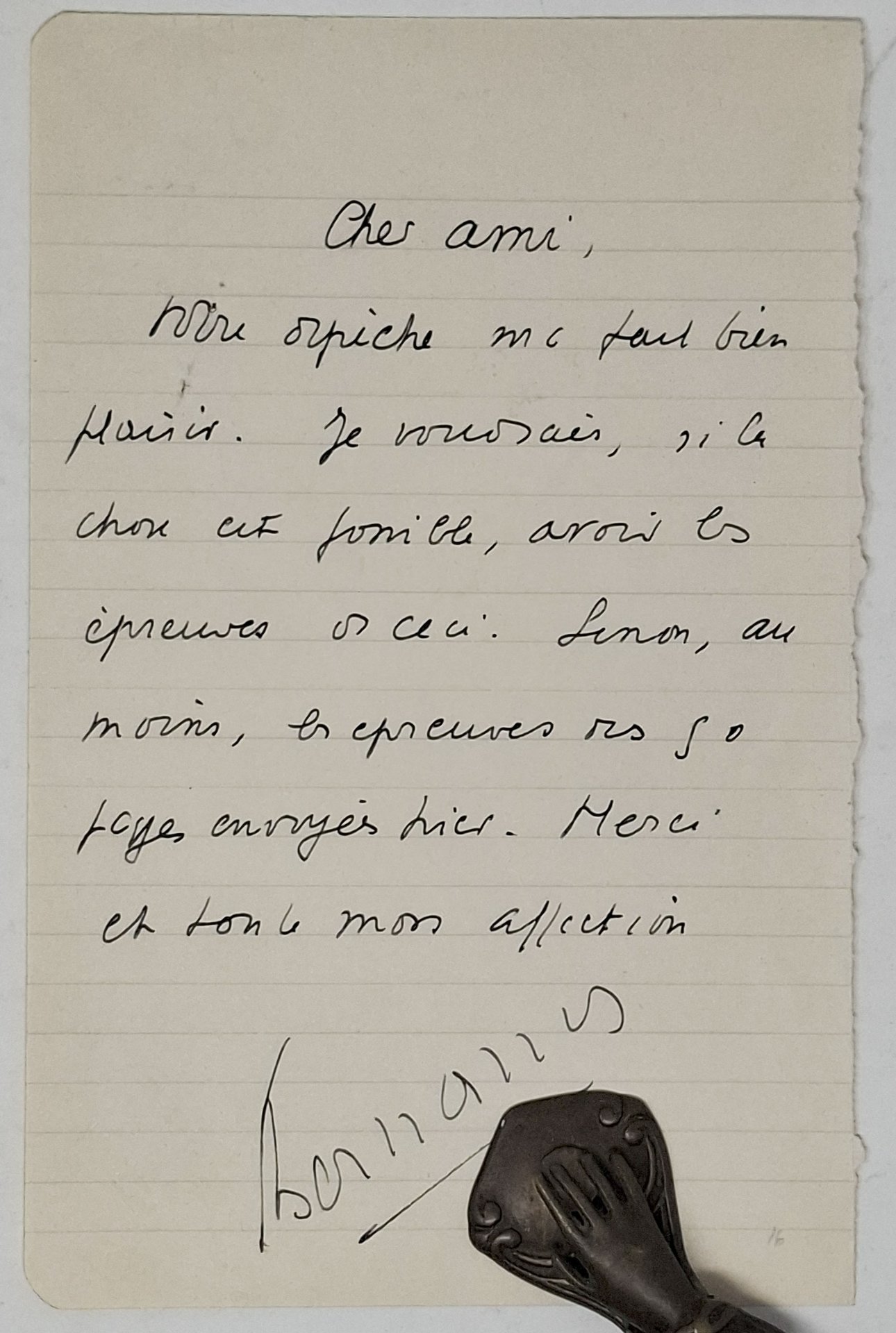 Testo manoscritto su una facciata di un foglio a righe strappato da un quaderno, non datato, con autografo originale, a penna, del celebre scrittore francese Georges Bernanos (1888 - 1948) che si firma 'Bernanos'. Testo della lettera in lingua francese. ben conservato. Formato del foglio: 13,5 x 21 cm circa.
