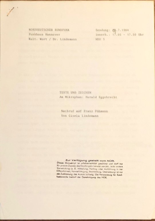 Die einst bekannte NDR-Literaturkritikerin Gisela Lindemann (Redaktion: Kulturelles Wort) schrieb diesen gehaltvollen Nachruf. Der Text wurde laut handschriftlichem Eintrag in der Sendung am 9. Juli 1984, nur einen Tag nach Fühmanns Tod, von Harald Eggebrecht am Mikrophon vorgetragen. Der Text ging nach aktuellem Stand später in einen Zeitungsartikel ein, eine weitere vollständige Publikation ist nicht zu verzeichnen. Hier liegt das Vortragsmanuskript vor, mit den handschriftlichen Korrekturen der Autorin. Es handelt sich um eine zeitgenössische Kopie, welche damals an die für Fühmann sehr wichtige Autorenbuchhandlung in Westberlin (Carmerstraße, Berlin-Charlottenburg) übergeben wurde. Lindemann schreibt in ihrem Nachruf über Fühmann: "Vielleicht war es ja überhaupt so, da Franz Fühmann ein durch und durch literarischer Mensch war, einer also, der nicht mit der Literatur lebte, sondern in ihr, daß er die größte Nähe zu sich selbst erreichte im Umgang mit den Texten anderer [.] Andererseits wäre die erstaunliche Kraft in seinen literarischen Essays wohl nicht denkbar ohne die Vision, einmal doch, und sei es noch so schmerzhaft, bis zum Kern des vielfach gestrandeten vielfach entmutigten und doch immer wieder zu größerer Hoffnung aufbrechenden Ich vorzudringen. Er wollte zuletzt wohl vor allem unbedingt weiterleben, um diesen Sprung noch einmal zu versuchen; er hat entsetzliche Strapazen auf sich genommen um dieser größeren Hoffnung willen, an der ihn auch die Familie hielt, seine Frau, seine Tochter, seine Enkelin [.]. Er hatte noch so viel zu tun, aber seine Kräfte waren aufgebraucht: buchstäblich zersplissen von diesem stellvertretenden Sichabarbeiten an seinen Gegenständen und an sich selbst [.]." Die Manuskriptfassung stammt aus dem Nachlaß der einstigen Lieblingsbuchhändlerin Franz Fühmanns in Westberlin.