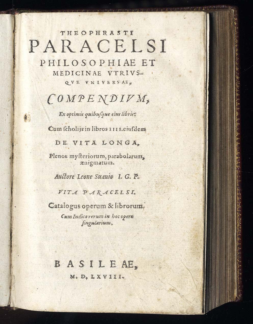 Th. Paracelsi Philosophiae et Medicinae utriusque universae, compendium, ex optimis quibusque eius libris; Cum scholjis in libros IIII, eiusdem de Vita Longa, plenos mysteriorum, parabolarum, aenigmatum.  Auctore Leone Suavio.