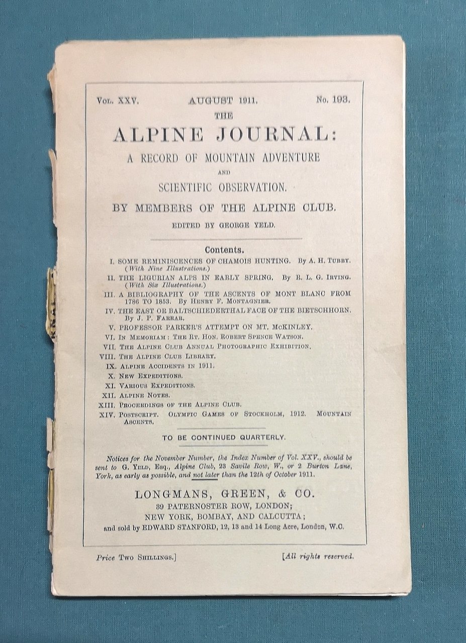 The Alpine Journal: a record of Mountain Adventure and scientific observation by members of the Alpine Club. Vol. XXV, August 1911, n. 193.