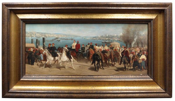 Oil on wood. Signed and dated. Framed (455 x 258 mm). Museum-quality panoramic painting of Istanbul with steamships and sailboats on the Golden Horn and the Hagia Sophia in the background. The foreground is dominated by the Grand Vezier Hüseyin Avni Pasha in a coach, escorted by horsemen, surrounded by a crowd. - The Regensburg-born Heinrich Lang, noted painter of horses and battles as well as writer and illustrator, studied with Karl Steffek in Berlin, Friedrich Voltz and Franz Adam in Munich and Adolf Schreyer in Paris. He travelled to Greece and Turkey and proved himself a careful observer of Ottoman costume and culture. His colourful paintings of Turkish tradesmen, camel drivers, donkey-drawn wagons and splendidly decorated carriages show his great attention to detail and were greeted by contemporaries as a much-welcomed relief from the grey military scenes that had dominated the previous years (cf. ADB Ll, 551).