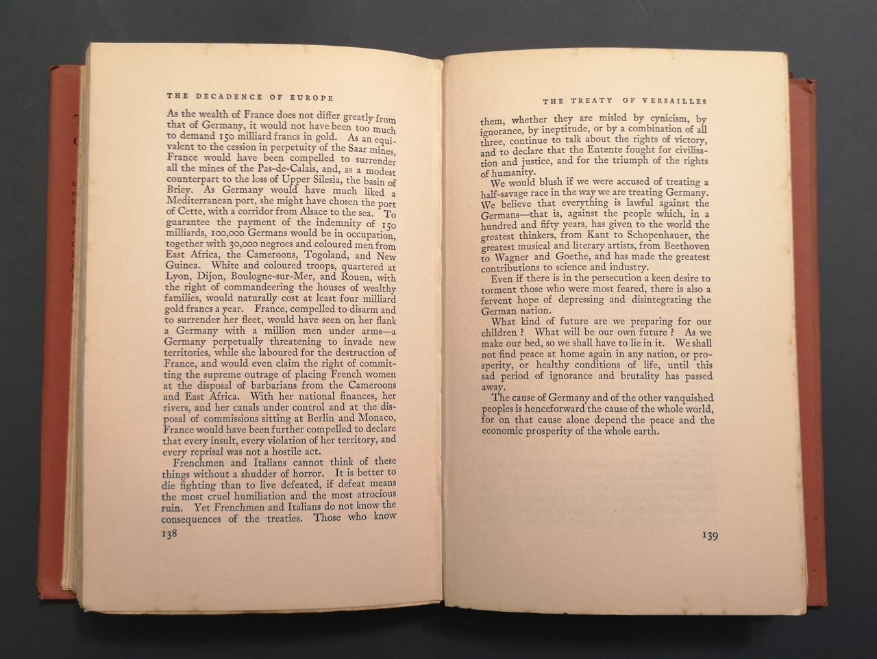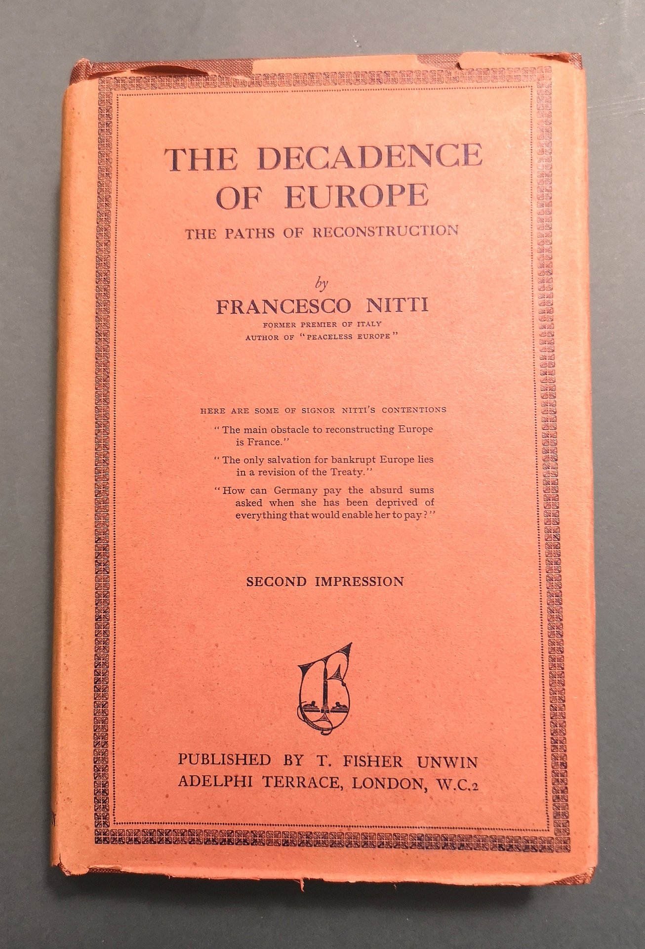 >in-8, pp. XXII, 279, (1); legatura in tela editoriale con titolo in oro al dorso, sovracoperta (con piccole mancanze). Prima edizione della traduzione inglese di F. Brittain, seconda impressione. L'opera fa parte della trilogia sull'andamento politico in Europa composta da L'Europa senza pace, La decadenza dell'Europa e La tragedia dell'Europa, scritte tra il 1922 e il 1923 durante il ritiro nella nella sua villa ad Acquafredda di Maratea, una sorta di autoesilio che l'anno dopo si sarebbe trasformato in un vero esilio antifascista, il primo di una lunga serie di politici e intellettuali. Dopo il discorso del Bivacco di Mussolini, Nitti si rifiutò di riconoscere la legittimità del governo fascista e abbandonò l'aula per protesta, a causa della sua astensione, iniziò ad essere vittima di intimidazioni fasciste. Buon esemplare, sporadiche arrossature della carta ai primi foglio.