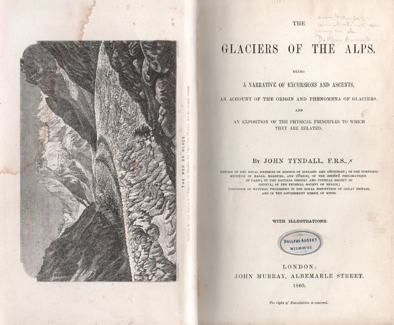 In-8°, legatura editoriale in tutta tela rossa con impressioni a secco ai piatti e titoli in oro al dorso, pp. XX-(2)444 e 32 di catalogo editoriale. Con 6 tavole fuori testo, alcune delle quali a colori, e 55 vignette xilografiche intercalate nel testo. Prima edizione di questa prima opera di Tyndall dedicata all'alpinismo e ai ghiaccciai. Consta di due parti, di cui la prima essenzialmente descrittiva (tra le altre cose vi narrano le due ascensioni del Monte Bianco e del Monte Rosa), e la seconda scientifca. L'opera contiene una nuova teoria sulla la formazione dei ghiacciai, in contrasto con le ipotesi enunciate da J. Forbes.