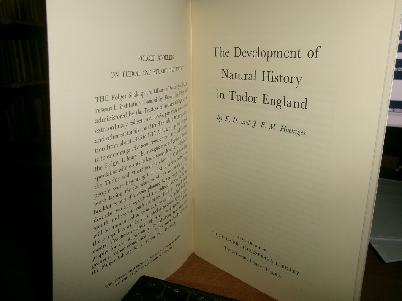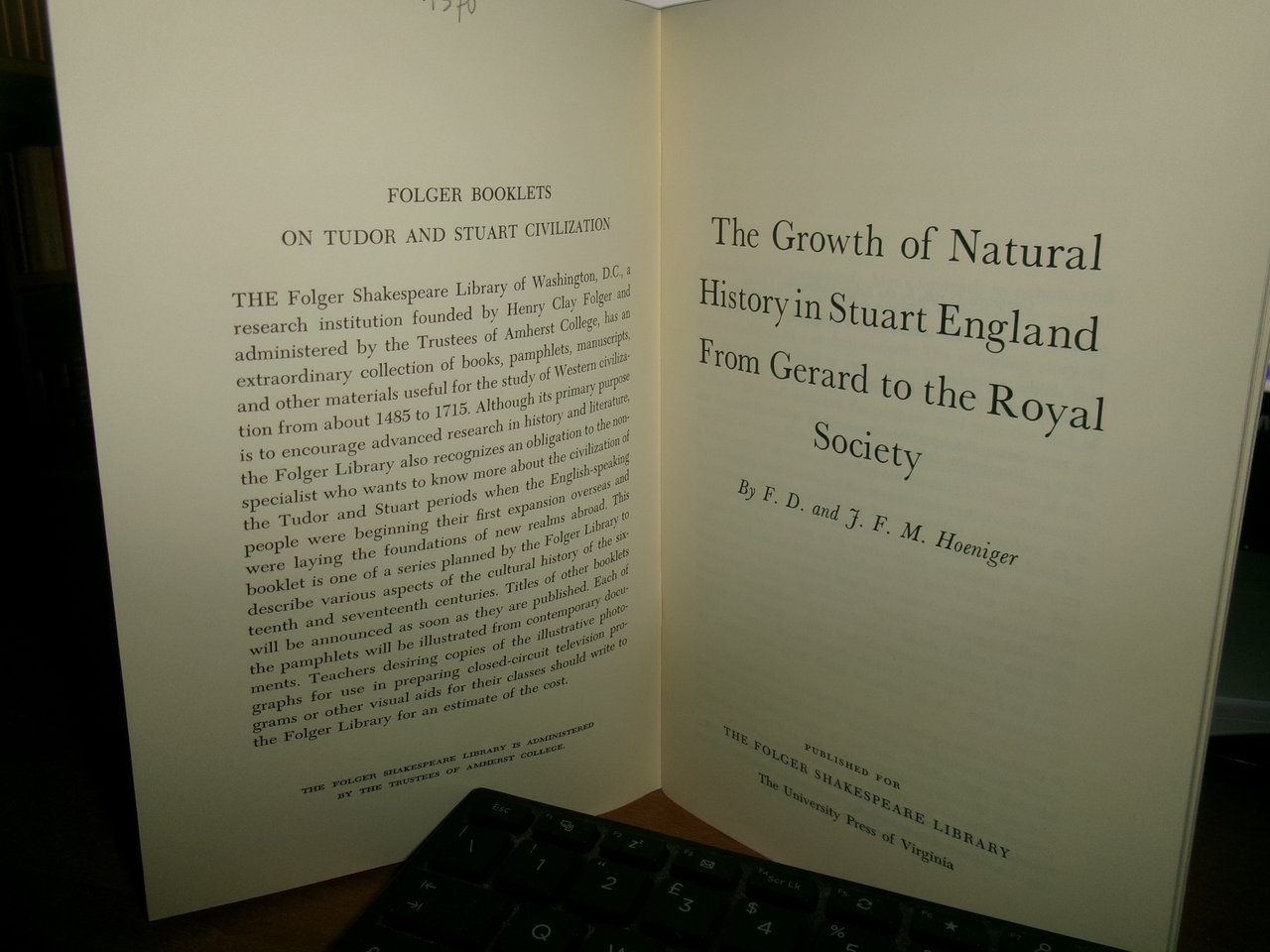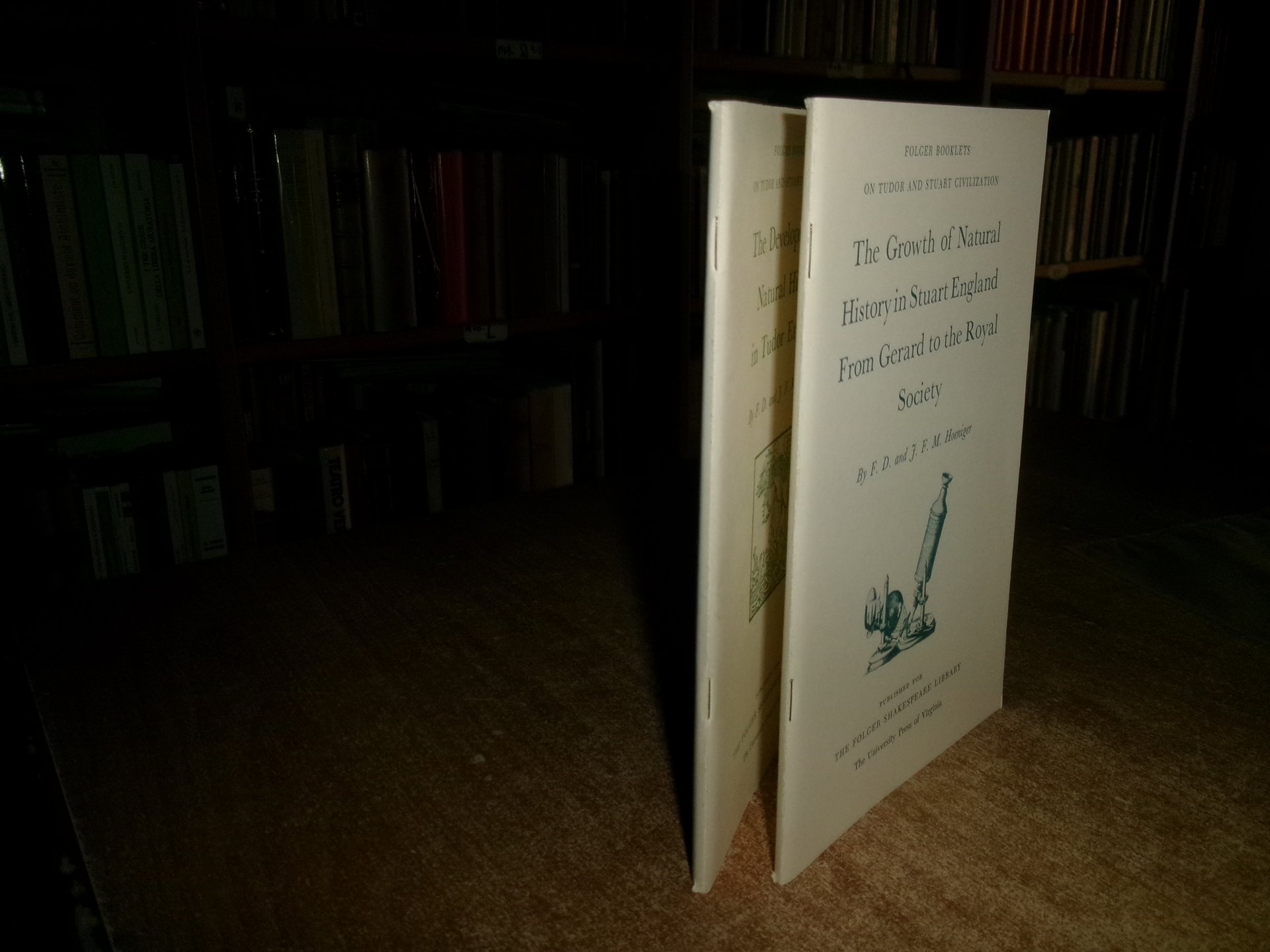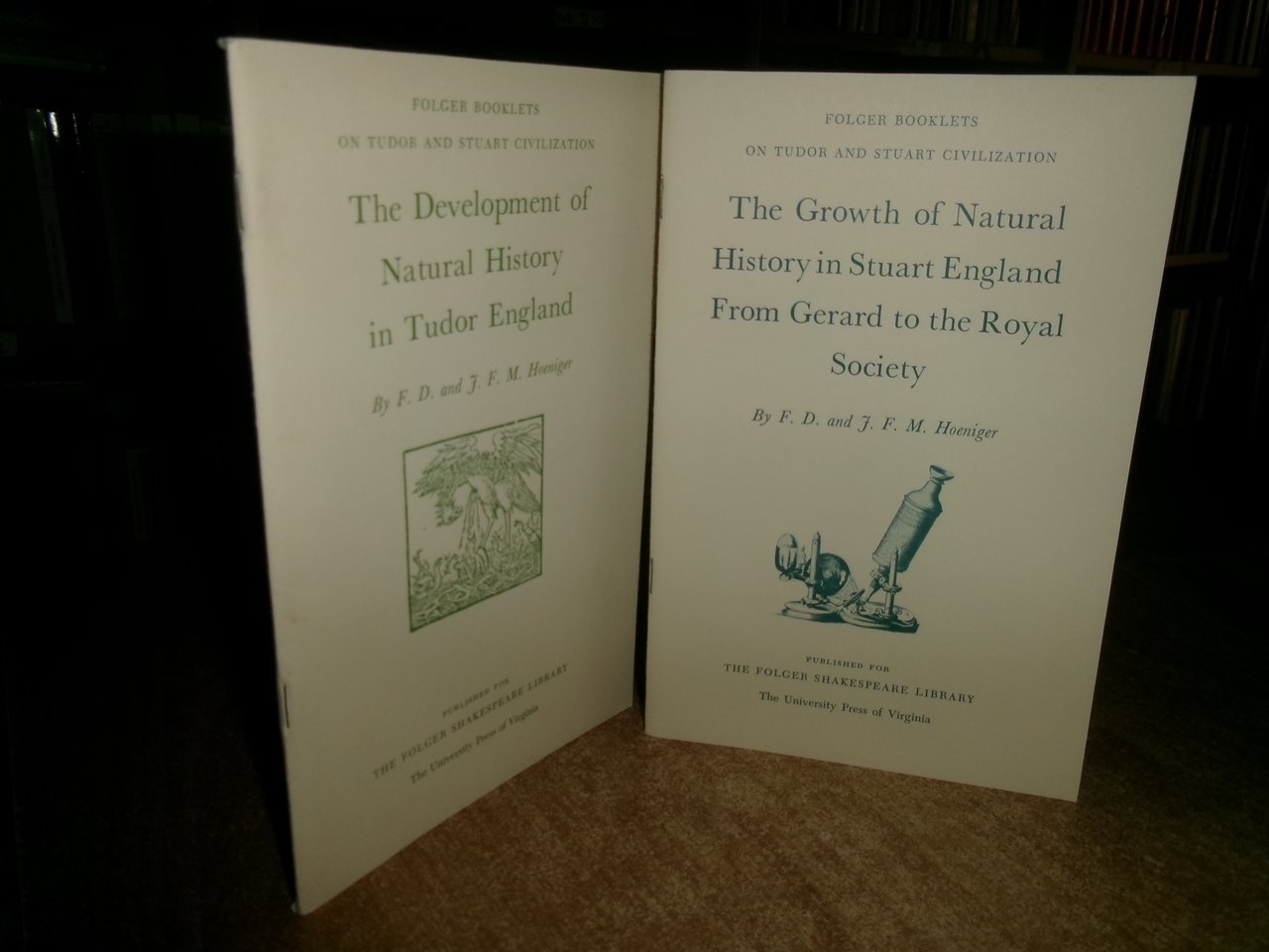 FOLGER BOOKLETS. Published for The Folger Shakespeare Library. The University Press of Virginia, 1969. The Growth of Natural History in Stuart England From Gerard to the Royal Society.The Developmentof Natural History in Tudor England. By F. D. and J. F. M. Hoeniger. 2 piccoli libretti in-8°, br. edit. con punti metallici. 54 pp. con 19 tavole f.t.; 60 pp. con 20 tavole f.t. Come nuovi con testo in inglese. Neg. nat. mob. 0 in busta trasp.