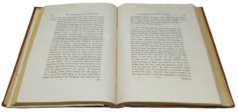 >in-4 (280x205 mm), pp. XII, 364, (12, Index), legatura coeva in p. vitello, dorso a nervi, titolo oro (cerniere deboli). Con due grandi carte geografiche incise del South East part of Asia ripiegate f.testo. Da pag. 253 a fine vi è una Appendice "containing Observations on the Civil Policy - The Laws and Judicial Proceedings - The Arts - The Sciences - and Religious Institutions, of the Indians". Prima edizione di una vasta e importante opera storica sull'antica India, sui suoi rapporti con il mondo, sul commercio e sulle istituzioni sociali indiane, narrate prima della scoperta del Passaggio a Nord-Ovest. Bell'esemplare, fresco e marginoso. Brunet, IV, 1332.