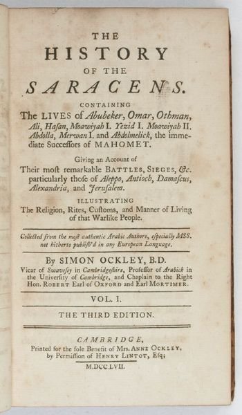 8vo. 2 vols. (4), XXI, (29), 80, 339, (21) pp. (4), LVIII, 325, (3), (327)-356, (12) pp. With a folding engraved plate. Contemporary calf; modern spines with giltstamped labels. All edges red. Third edition of this classic and influential work, first published in 1708. Ockley (1678-1720) was Professor of Arabic at the University of Cambridge. "The importance of Ockley's work in relation to the progress of oriental studies cannot be overestimated [.] Ockley for the first time made the history of the early Saracen conquests attractive to the general reader, and stimulated the student to further research. [The 'History'] became a secondary classic, and formed for generations the main source of the average notions of early Mohammedan history" (DNB XLI, 364). The plate shows the Kaaba at Mecca, engraved after a drawing preserved in a manuscript in the Bodleian Library in Oxford. The manuscript, which formed the basis of Ockley's work, is now known as the ‘Futûh esh-Sham by pseudo-Waqidi. - Browned and brownstained throughout. From the library of the British philosopher of religion, David Arthur Pailin (b. 1936), with his bookplate; also with engr. bookplate of Robert Fellowes (of Shotesham/Shottesham, Norfolk, d. 1869?). - BM 174, p. 334. Gay 98. Graesse V, 7. OCLC 6595742. Cf. NYPL Arabia coll. 33 (1st and later editions).