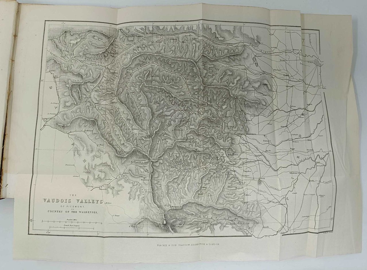 >2 vol. in-8, pp. XXX, 478; XVI, 540; legatura editoriale piena percallina marrone chiaro con decorazioni a secco ed in oro sui piatti e ai dorsi. Illustrato da 2 titoli incisi con vignetta, 2 carte geografiche ripiegate e 13 tavole f.t. finemente incise in acciaio da vari artisti, con scene storiche, paesaggi di montagna e vedute (bel panorama generale delle Valli Valdesi su due pag., Saluzzo, Villar, Torre Pellice, Bobbio, Perosa, Luserna S. Giovanni, ecc.). Prima edizione della traduzione inglese, completa, di questa approfondita e documentata storia dei Valdesi (l'originale francese era apparsa nel 1851), prima bibliografia sistematica delle fonti edite ed inedite relative alla storia valdese, che attiene ampiamente alle montagne e valli del Piemonte . Esemplare freschissimo. Non in Perret. Hugon-Gonnet n. 78.