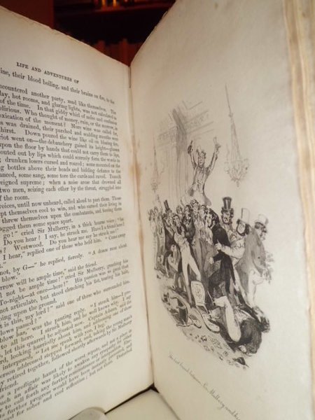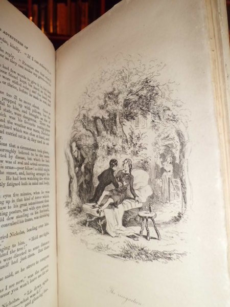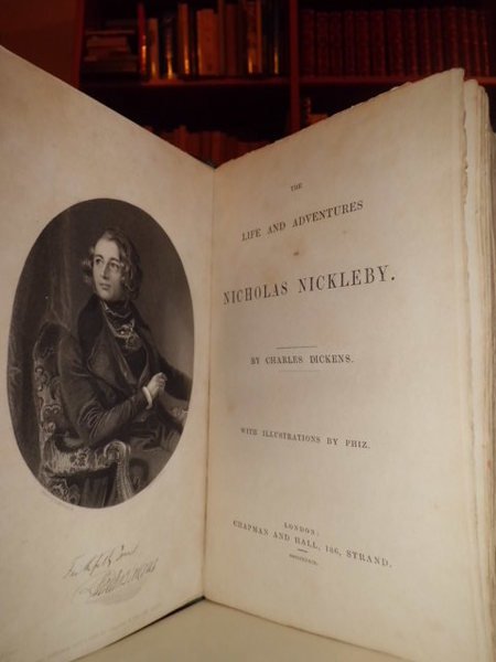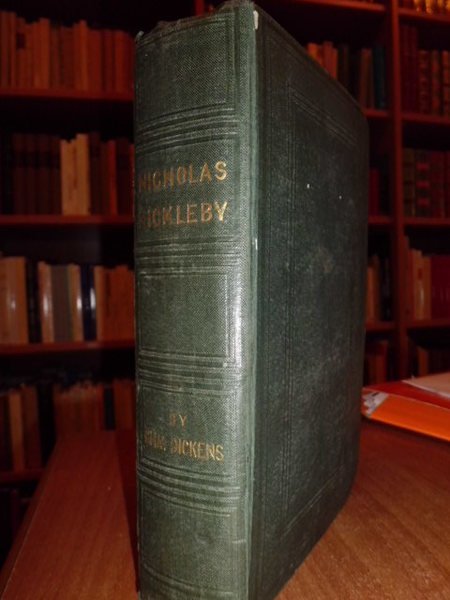 The Life and Adventures of Nicholas Nickleby. With illustrations by Phiz. By Charles, Dickens. London, Chapman and Hall, 186 Strand,1839. In-8°, tela edit. xvi, 624 pp. con ritratto e 39 tavole incise in acciaio f.t. con figure caricaturali. Rara edizione originale corredata dalle curiose illustrazioni di Phiz (Hablot Knight Browne), book illustrator and humorous artist. Browne's draught smanship was in the tradition of the Regency, verging on caricature, scratchy in execution and not always vey assurd in the penwork. (Houfe, Dictionary of British book illustrators and caricatures, p. 248). Manca al Lowndes.