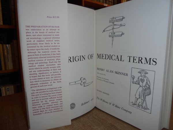 Alan, Skinner. Baltimore, The Williams & Wilkins Company, 1961. The Origin of MEDICAL TERMS. Second edition. In-8°, tela bleu con titoli in oro al dorso, sovracopertina. x, 438 pp. con numerosi ritratti e illustrazioni nel testo. In ottimo stato di conservazione. Uff. C - IV - 5