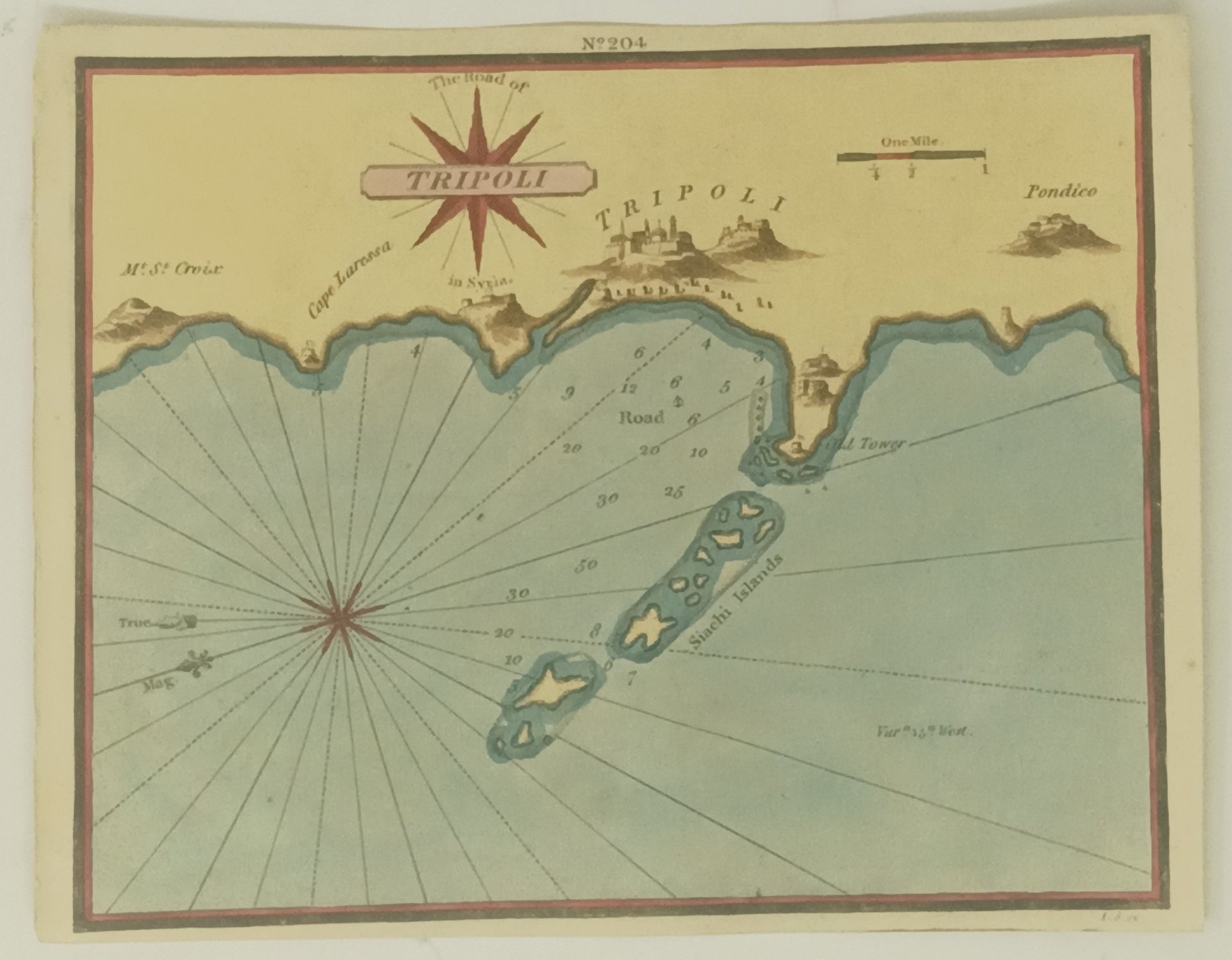 >Incisione originale (155x195 colorata da mano coeva, tratta da: The Mediterranean Pilot, Containing Two Hundred and Twenty-four Accurate Plans of the Principal Harbours, Bays, Roadsteads, and Islands in the Mediterranean Sea Including Those in the Gulf of Venice, Archipelago, Sea of Marmora, and the Levant, Drawn from the French & Italian Surveys of Michelot, Bremond, & Ayrouard ; and from Those of Mess. John Wilson and Joseph Foss Dessiou, Masters in the Royal Navy. Bellissimo e decorativo portolano raffigurante il Golfo di Tripoli, in Libano.