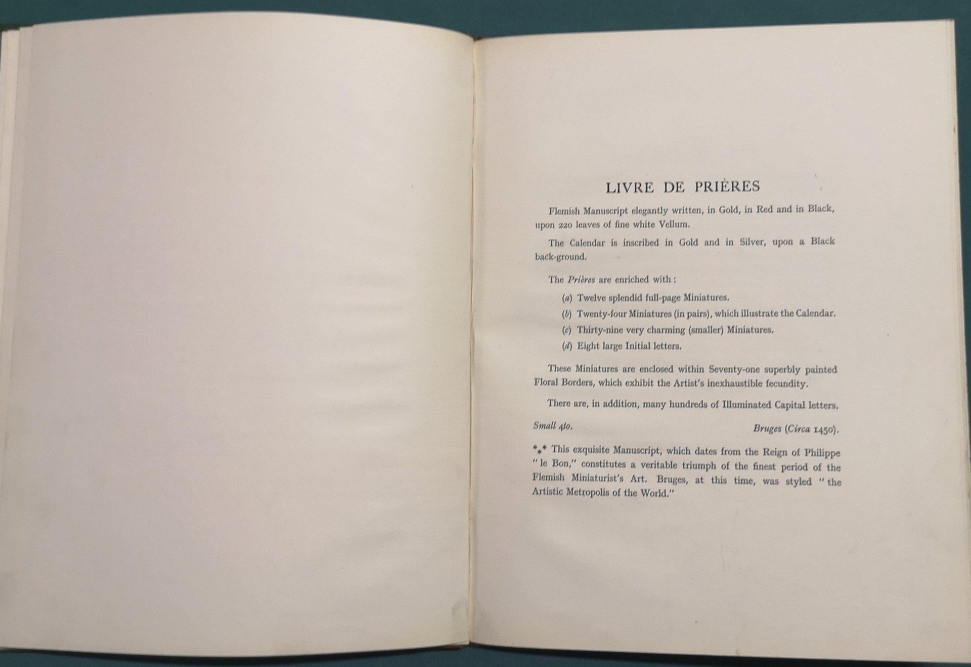 The Van Varssenaere livre de prières (1450). Enclosed within a mosaïque binding by Padeloup. Twenty-five copies, privately printed.