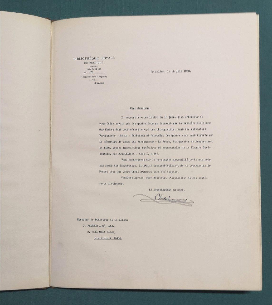 >in-4, pp. (2), 10, legatura in m. marocchino, titolo in oro al dorso. Edizione originale, impressa in soli 15 esemplari fuori commercio, di questo studio bibliografico su un libro d'ore miniato di origine fiamminga appartenuto al borgomastro di Bruges Josse van Varssenaere. Rarissimo opuscolo di argomento bibliografico, censito in sole 3 biblioteche al mondo. Perfetto esemplare.