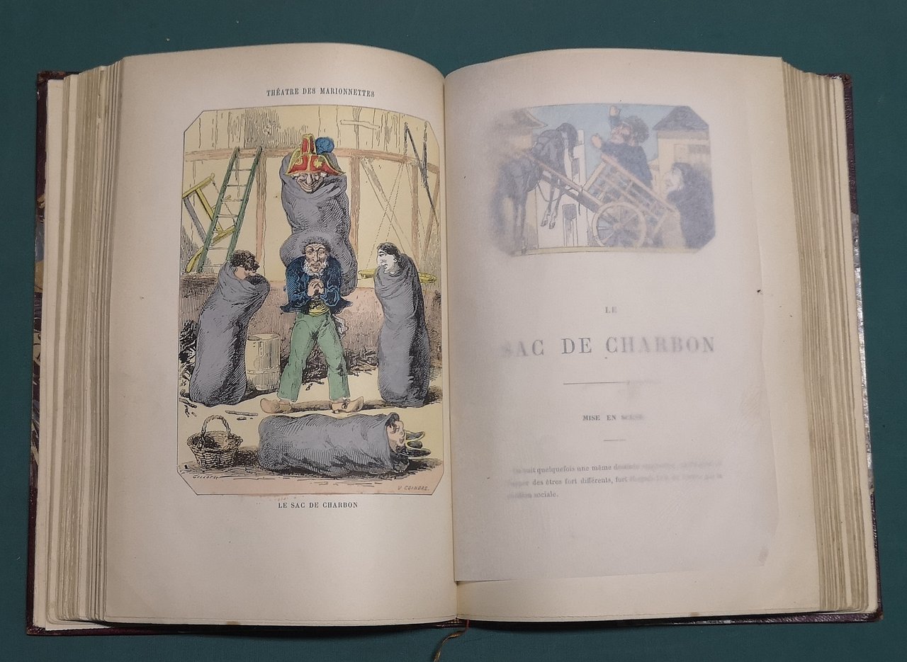 >in-4, pp. (4), 387, (3), ben leg. m. pelle e angoli, tit. oro al dorso a nervi. Raccolta di 24 testi di spettacoli per marionette. Ogni pièce è adorna di due incisioni realizzate a colori su legno di testa, la prima incisione a p. pag. in antiporta e la seconda a m. pag. con funzione di frontalino. Tra i 24 testi figurano: Polichinelle précepteur, la tragédie d'Arlequin, Pierrot et le pâtissier, le mirroir de Colombine. Bell'esemplare.