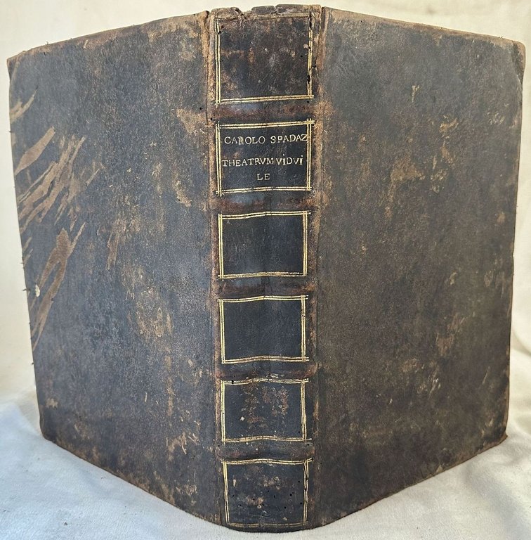 Edizione del 1672 di questo trattato sulle vedove e relativa legislazione scritto da Carlo Spadazzi o Spadazza da Fusignano giudice a Ferrara e governatore di Vignola dal 1680 al 1681. L'opera è dedicata a Eleonora Maddalena Gonzaga Nevers (Mantova 1628-Vienna 1685) figlia di Charles Duca di Nevers e Maria Gonzaga. Eleonora a seguito dell'unione con Ferdinando III divenne Imperattrice del Sacro Romano Impero e Regina di Germania. Ferdinando venne a mancare nel 1657 ma Eleonora continuò il suo progetto di promozione delle arti e lettere. L'opera, scritta 15 anno dopo, descrive condizioni e privilegi delle vedove analizzando le leggi civili e morali che si applicano alle vedove illustri. Marca editoriale al frontespizio: Sulla riva del mare un cane addenta un murice, sullo sfondo un'altura e due imbarcazioni al largo. In una cornice motto: Ex morsu purpura. Testatine e iniziali xilografiche ornate. Testo a doppia colonna. Tagli marmorizzati. In ottime condizioni. Copertina in piena pelle coeva con titolo e decorazioni in oro al dorso in buone condizioni generali con lievi usure ai margini e dorso. Legatura in buone condizioni. All'interno le pagine si presentano in ottime condizioni con rare fioriture. SEgni di tarlo al contropiatto. In folio. cm 32,5x22,5. Pp. (16)+972. Peso Kg. 2,600Edition of 1672 of this treaty about widows and relating laws written by Carlo Spadazzi o Spadazza da Fusignano judge in Ferrara and governor of Vignola from 1680 to 1681. The work is dedicated to Eleonora Maddalena Gonzaga-Nevers (Mantua, 1628 – Vienna, 1686) daughter of Charles, Duke of Nevers (1609-1631) and Maria Gonzaga. Eleonora became Empress of the Holy Roman Empire and Queen of Germany, marrying Ferdinand III (with whom she had four children). After Ferdinand's death in 1657, she continued his work of promoting arts and letters. The treatise was dedicated to her in 1672, when she had been a widow for 15 years. Condition and privileges of widows: a treatise that explains the civil and moral laws that apply to illustrious widows. Editorial mark in the title page: Sulla riva del mare un cane addenta un murice, sullo sfondo un'altura e due imbarcazioni al largo. In una cornice motto: Ex morsu purpura. Woodcut initials and vignettes. Text in double column. Marbled fore edges. In very good conditions. Full leather coeval cover with gilted title and decorations in the spine in good general conditions lightly worn in the extremities. Binding in good conditions. Pages in very good conditions with occasional foxing. Worming in the counterplate. In folio. cm 32,5x22,5. Pp. (16)+972. Peso Kg. 2,600<BR><BR>