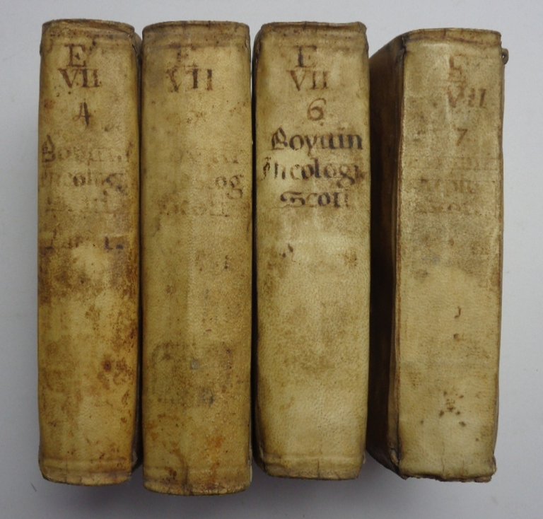 "… seu Opus theologicum studentibus sic attemperatum, [...] Authore v.p. Ioanne Gabriele Boyvin [...] In quatuor partes diuisa". Quattro volumi (9,5x16,5 cm), piena pergamena coeva con titolo manoscritto al dorso (sbiadito ai volumi I, II e IV, ben visibile al volume III). Volume I (Prima pars): (40)-586 pagine. Normali tracce del tempo e sporadiche macchie alla legatura. Prime pagine brunite, firme di possesso al frontespizio. Mancanza senza perdite di testo alla pagina (non numerata) 21-22; strappetto al margine esterno della pagina 111-112 e 147-148. Rare piccole fioriture. Volume II (Secunda pars): (24)-648 pagine. La legatura presenta una piccola crepa nella pergamena al piatto anteriore e una mancanza al piatto posteriore, oltre alle normali tracce del tempo. Timbro muto al foglio di risgurdia anteriore, firma di possesso al frontespizio. Strappetto sul margine bianco e piccole macchie d'inchiostro alla pagina 7-8. Rare piccole fioriture. Volume III (Tertia pars): (26)-609-(3) pagine. Normali tracce del tempo e sporadiche macchie alla legatura. Due piccoli fori alla carta di risguardia anteriore. Strappo orizzontale senza perdite e firma di possesso al frontespizio; errori di impaginazione e di numerazione alle pagine non numerate che sono comunque tutte presenti; la sequenza in numeri arabi è invece corretta. Strappo orizzontale senza perdine alla pagina 7-8. Rare bruniture o piccole fioriture. Volume IV (Quarta pars): (24)-578 pagine. La legatura risulta leggermente allentata oltre a presentare le normali tracce del tempo. Firma di possesso al frontespizio, sporadici segni di studio sui margini. Rare bruniture o fioriture. Seconda edizione di questa importante illustrazione della dottrina di Scoto (la prima è di Caen, 1665-71). Boyvin, francescano (1605-1681) deve la sua fama proprio a questo corso di teologia e filosofia scotistica: “Il ne cite que très rarement d'autres auteurs de son ordre ou des adversaires doctrinaux, et ne se risque pas à des interprétations personnelles de l'œuvre de Duns Scot. Leur petit format ainsi que leur caractère très pédagogique leur assurèrent toutefois une très large diffusion, et ils furent fréquemment réimprimés jusqu'au début du XVIIIe siècle”.