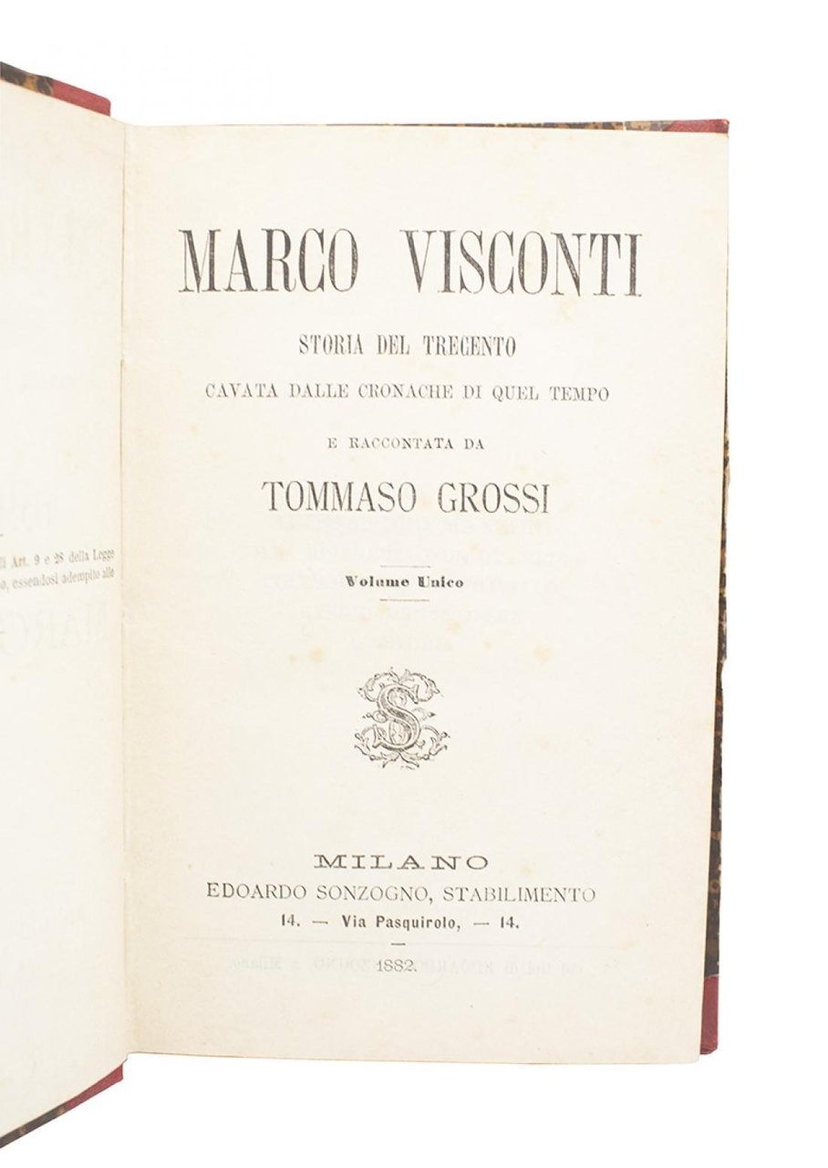 Autore: Tommaso Grossi Titolo: Marco Visconti Sottotitolo: Storia del trecento cavata dalle cronache di quel tempo e raccontata da Tommaso Grossi - Volume Unico Edizione: Edoardo Sonzogno Editore - Milano 1882 Dimensioni: 12 x 18 cm c.a. Pagine: 362 Copertina: Cartonato Condizioni: Buone come da foto