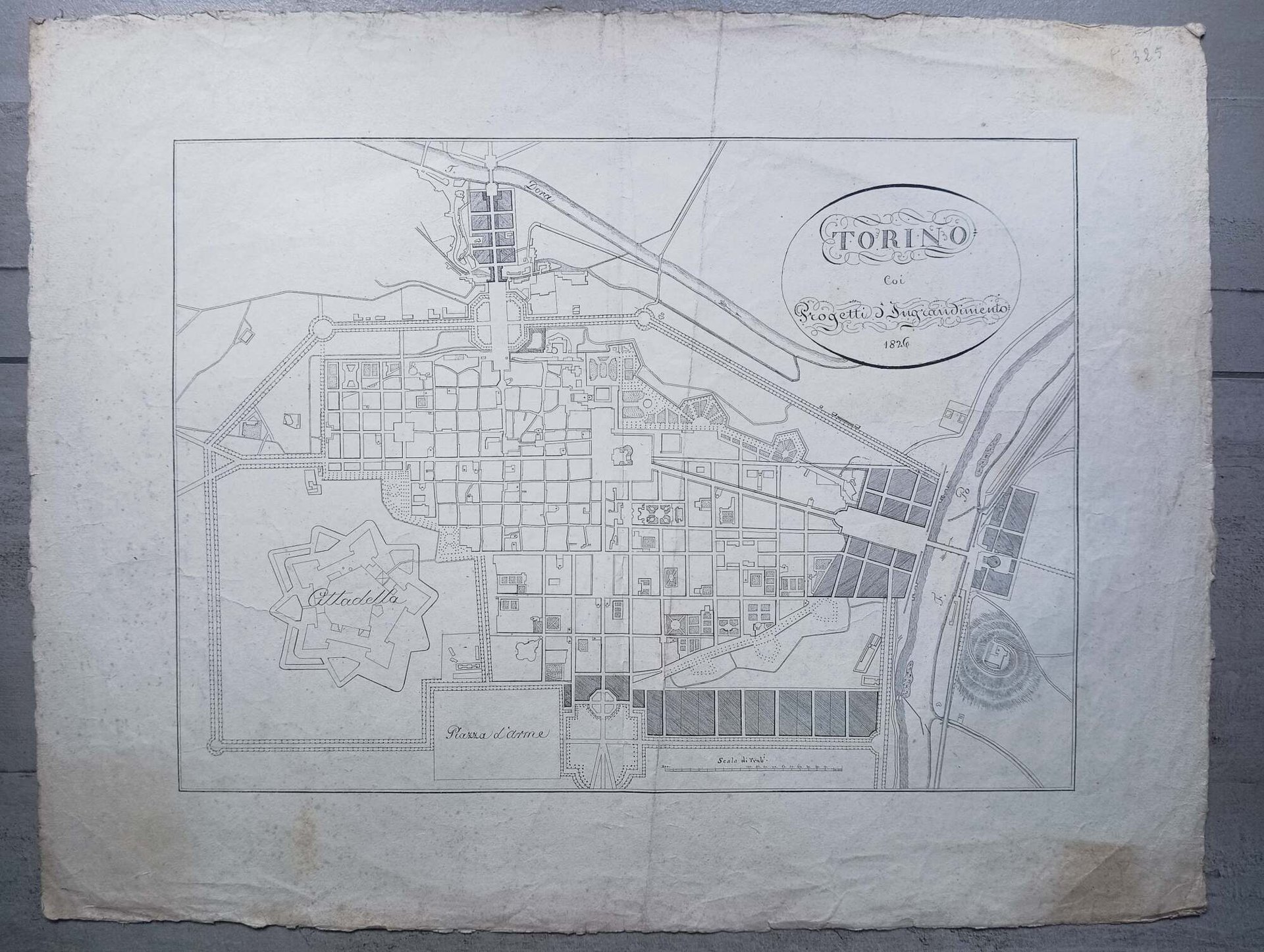 >Litografia (mm 340 x 470) con ampi margini, anonima. Titolo in alto a destra entro ovale: "TORINO | Coi | Progetti d'Ingrandimento | 1826". Nel medesimo anno Re Carlo Felice approvò la costruzione di nuovi quartieri, tra cui quello che comprende dieci isolati a Borgo Dora, sulla direttrice che porta al Ponte in pietra progettato dall'architetto Carlo Mosca; i due isolati con portici all'ingresso di Porta Nuova, con la piazza denominata poi Carlo Felice; i palazzi adiacenti al corso Vittorio Emanuele da Porta Nuova al Po; la grande piazza progettata dall'architetto Frizzi denominata poi Vittorio Emanuele e la costruzione di edifici al di là del fiume, nel borgo Po (attuale piazza Gran Madre di Dio e dintorni). Questi quartieri sono identificabili nella pianta in quanto colorati di scuro. Rara, qualche fioritura. Peyrot II, 325