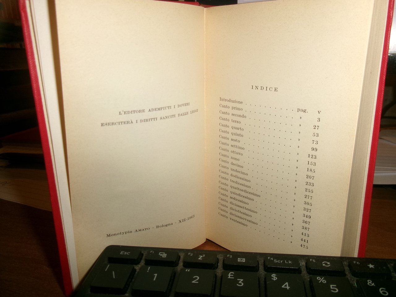 TORQUATO TASSO - GERUSALEMME LIBERATA a cura di Ezio Raimondi. Bologna, Zanichelli, 1963. In-16° piccolo, tela edit. rossa con fregi e titolo in oro, taglio superiore in rosso. XXXII, 511 pp. con ritratto in antiporta. In ottimo stato. Neg. scat. ultimi Hoepli.