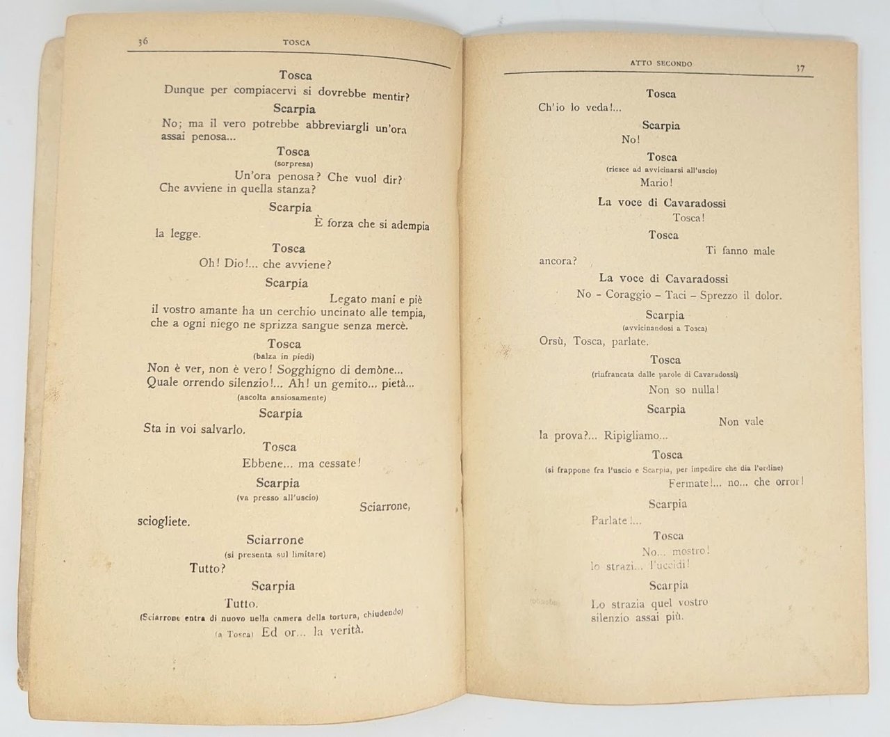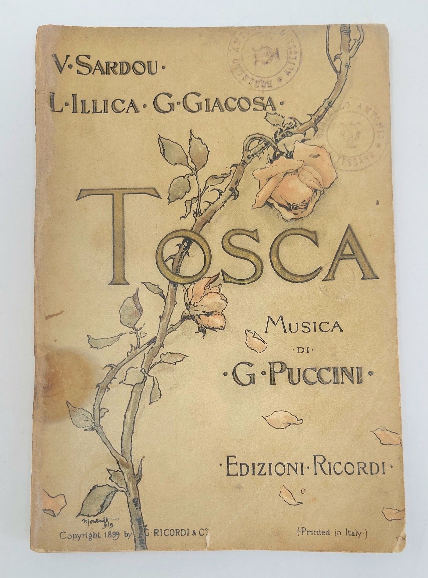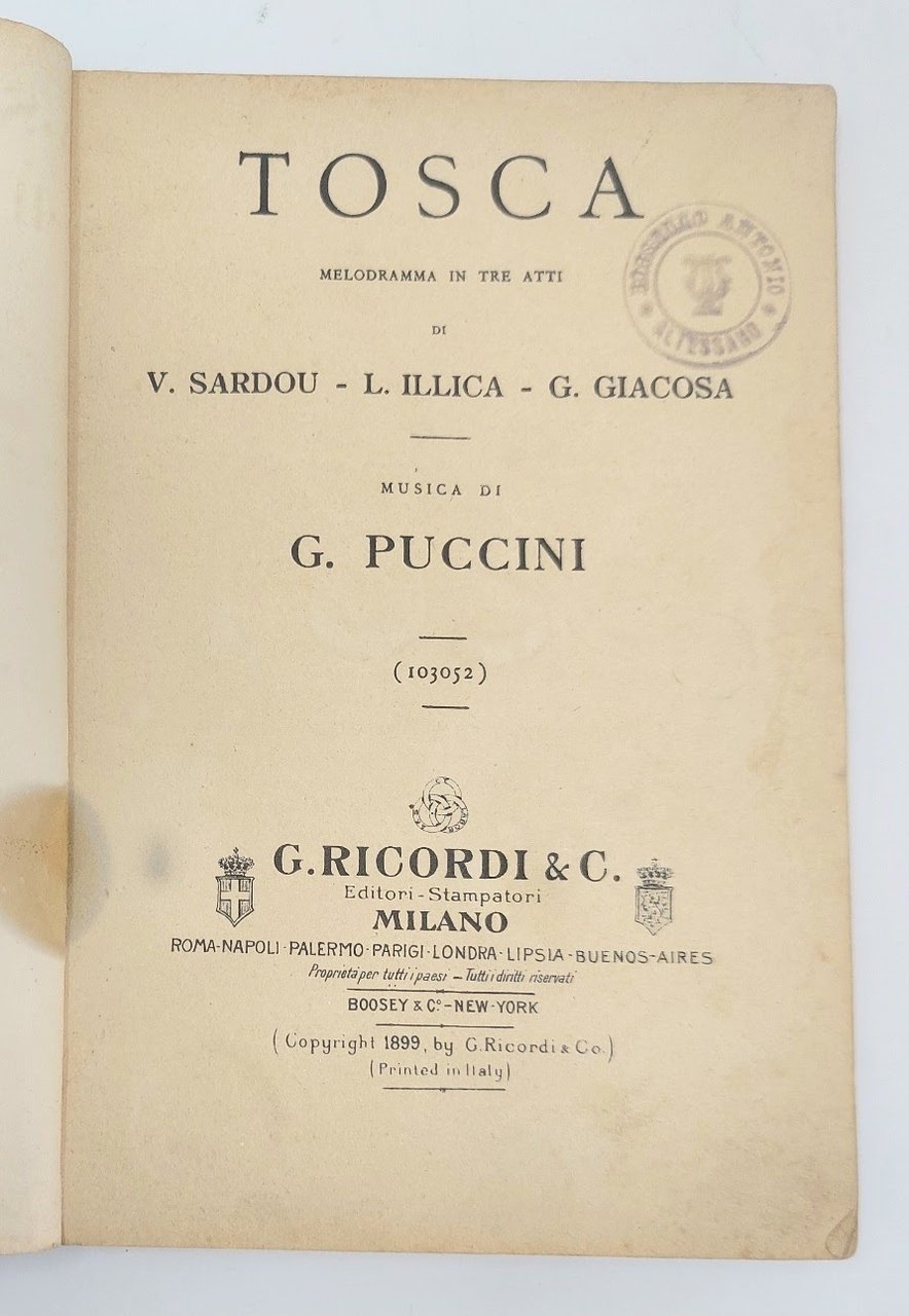 >in-8 piccolo (195x130 mm), pp. 59, (5 di reclame di altri libretti d'opera). Elegante brossura editoriale figurata a colori (dorso anticamente rinforzato). Prima edizione del libretto d'opera della Tosca, che fu infatti terminata da Puccini nell'ottobre 1899 e messa in scena al Teatro Costanzi di Roma il 14 gennaio 1900. Il libretto, di Giuseppe Giacosa e Luigi Illica, deriva dal dramma La Tosca di Victorien Sardou, rappresentato per la prima volta a Parigi nel 1887 al Théatre de la Porte-Saint-Martin di Parigi. Ottimo esemplare, pochi segni marginali a lapis blu, timbri sparsi di collezione estinta (Borsello Antonio Altessano).
