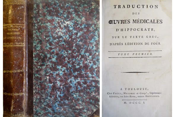 Traduction des Oeuvres Médicales d'Hippocrate, sur le texte grec, d'après l'édition de Foës. Tome Premier [sur quatre], contenant les onze premières des seize pièces qui composent la Première Partie.