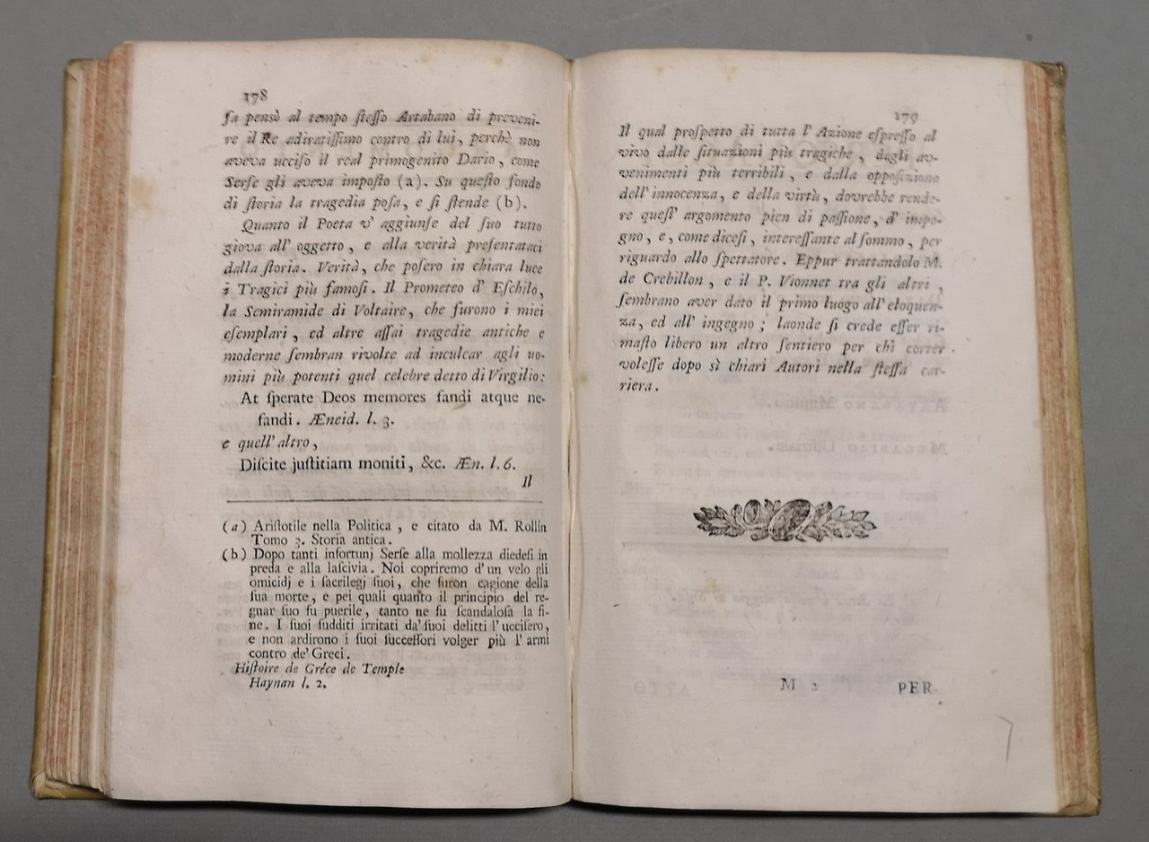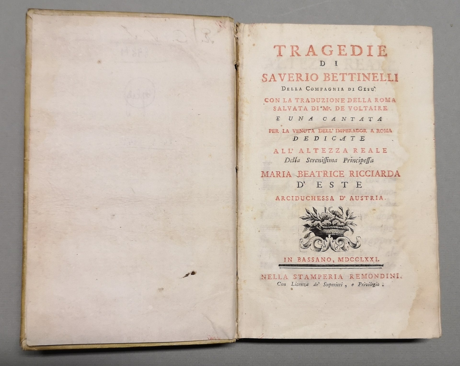 >in-8, pp. XL, 350, leg. coeva p. perg. Frontesp. a stampa rossa e nera e vignetta in rame, iniz. e finaletti silogr. Dedica dell'A. all'arciduchessa d'Austria Maria Beatrice Ricciarda. Prima edizione delle tre tragedie del Bettinelli (Gionata figlio di Saule, Demetrio Poliorcete o sia la virtù ateniese, Serse re di Persia), ''migliori assai dell'ordinario teatro gesuitico cui appartengono'' (Renda-Operati, p. 151). Le pagine preliminari contengono l'interessante ''Discorso intorno al teatro italiano e alla tragedia'' che si sofferma ''intorno alle miserabili condizioni del teatro italiano e ai più sicuri modi di procurargli favore ed onore'' (Bertana). La ''Roma salvata'' (pp. 263-332), tragedia che Voltaire compose intorno alla metà del XVIII secolo, appare qui tradotta in italiano per la prima volta. Bell'esempl. Bertana 265-7. De Backer-Sommervogel I, col. 1419, n. 17. DBI IX, pp. 738-743.