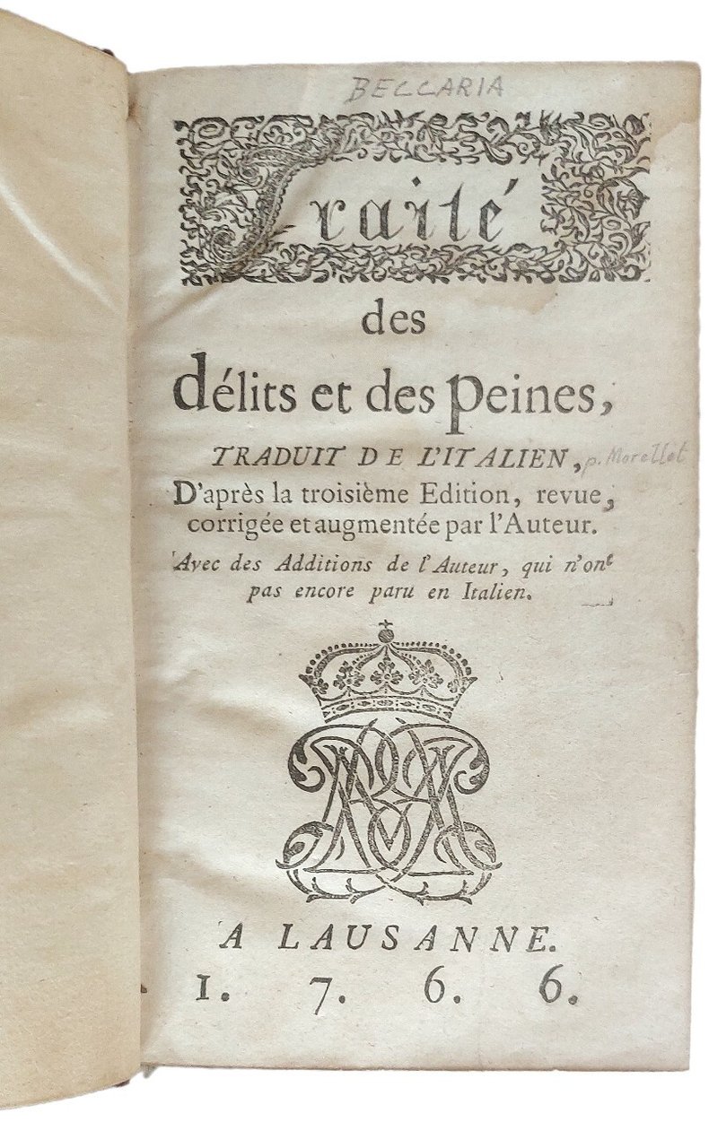 >In-8 (160x93 mm), pp. XXXI, 285, raffinata legatura alle armi di Béatrix de Choiseul, duchessa di Gramont, in marocchino granata con titolo ed eleganti fregi oro al dorso, triplice ordine di filetti ai piatti, dentelle int, tagli dorati. Al centro di entrambi, le armi con stemmi delle due famiglie. Prima traduzione francese di un testo fondamentale contro la pena di morte, appartenuta a una donna collezionista, morta sotto la ghigliottina nel 1794. Posteriore di due anni all'edizione originale italiana, del principale trattato sull'abolizione della torrtura e sui difetti del sistema di legislazione giudiziaria dei suoi tempi, commentato da Diderot e da Voltaire. Traduzione condotta sulla terza edizione italiana, riveduta e corretta dall'autore. D'Alembert, avutane una copia in regalo da Paolo Frisi, ne annunciò la traduzione francese di André Morellet e ne fece un'immediata entusiastica recensione sulla ''Gazette littéraire de l'Europe'' del 1° agosto 1765, amplificando, così, la fama dell'opera e del suo autore. E' sicuramente una tra le opere più innovative e rivoluzionarie sulla riforma penale e la criminologia, in opposizione alla pena di morte, in perfetta sintonia con le idee umanitarie dell'Illuminismo europeo. La Gramont fu molto influente alla corte di Versailles, e vicina a divenire la favorita di Louis XV, prima dell'arrivo a corte di Madame du Barry. Donna colta, la duchessa costituì una biblioteca scelta, che fece rilegare in marocchino. Fu dispersa all'asta il 16 ventoso dell'anno V, dopo la sua morte sulla ghigliottina il 17 aprile 1794. Bell'esemplare (alone ai primi due quaderni, graffio e angolo schiacciato al piatto posteriore). Clermont Tonnerre, “Une Bibliophile au temps de Louis XV”, in Revue d'Histoire littéraire xxxv, 1928, pp. 241-9. Firpo, Ediz. Nazionale I, pp. 288 e segg. Printing and Mind of Man 209 (ediz. orig. 1764).