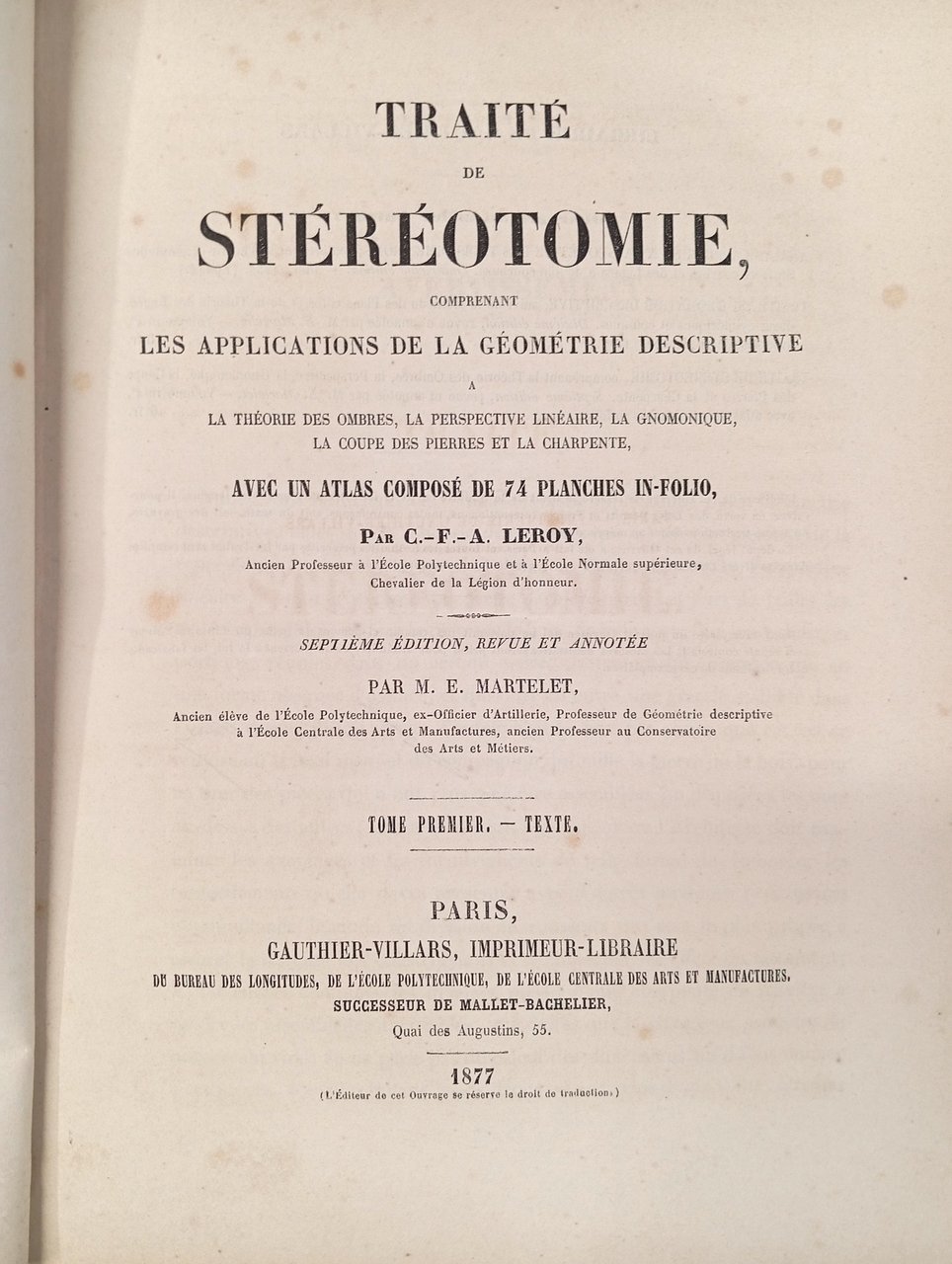 Traité de stéréotomie - comprenant les applications de la géométrie descriptive à la théorie des ombres, la perspective linéaire, la gnomonique, la coupe des pierres et la charpente (Tome premier)
