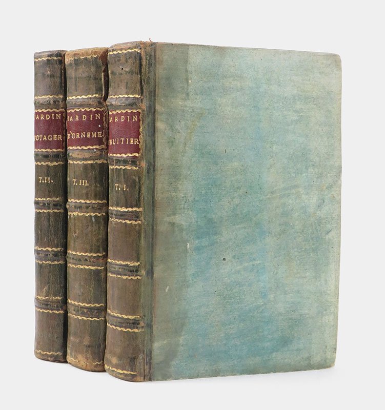 LIBROEdizione originale.Qualche carta occasionalmente brunita in modo uniforme; normali segni del tempo marginali alla legatura; ex libris «Ottavia Gambara»; nel complesso ottimo esemplare a grandi margini in legatura pressoché coeva.Set completo: «Première partie Jardin fruitier» (ben completo delle dodici tavole su carta azzurra legate in fine di volume); «Seconde partie Jardin potager»; «Troisième partie Jardin d’ornement».