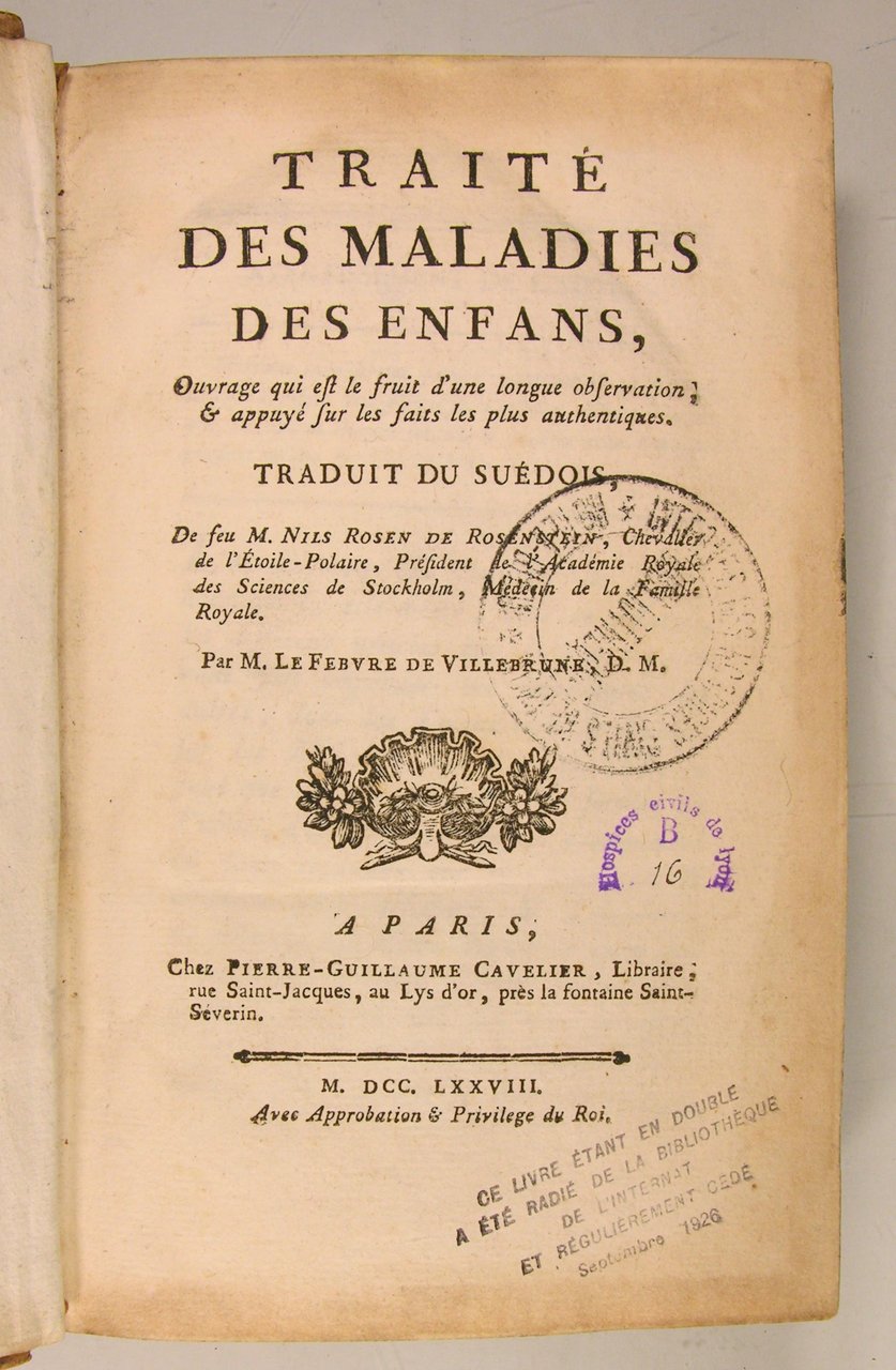 A Paris, chez Pierre Guillaume Cavelier, 1778. In/8 reliure plein veau du temps, dos à nerfs à caissons dorés et pièce de titre, 12 f., 582 pages. 1 f. Coiffes manquantes , mors supérieur très partiellement ouvert, petites usures aux coins, Tampon de bibliothèque, bon exemplaire cependant. traduit du Suédois par M. Le Febvre de Villebrune, D. M. L’auteur (1706 - 1773) enseigna à l’université d’Upsala, est considéré comme le fondateur de la pédiatrie. Le présent ouvrage originellement titré “De morbis infantum” connut un réel succès lors de sa parution en 1772. Il traite dans un langage simple et accessible au plus grand nombre, des affections touchant l’enfant du 18è, de conseil d’éducation sanitaires, de la nutrition des enfants ; un chapitre est consacré à la variole dont l’inoculation était encore controversée à l’époque.