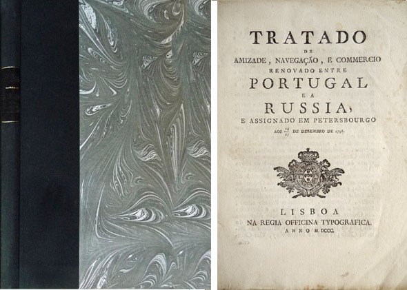 Lisboa, na Regia Officina Typographica, 1800. 4to.; 65 pp. Texto en portugués y francés en páginas enfrentadas. Encuadernación moderna en media tela. Renovación de un tratado anterior de 1787, de carácter comercial, entre los dos paises. Son de gran interés los artículos relativos al intercambio de productos coloniales con Brasil, la exportación de vinos portugueses y aquellos que tratan de las actividades de la flota portuguesa.