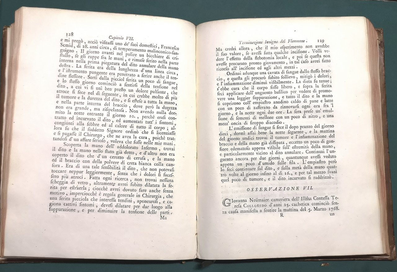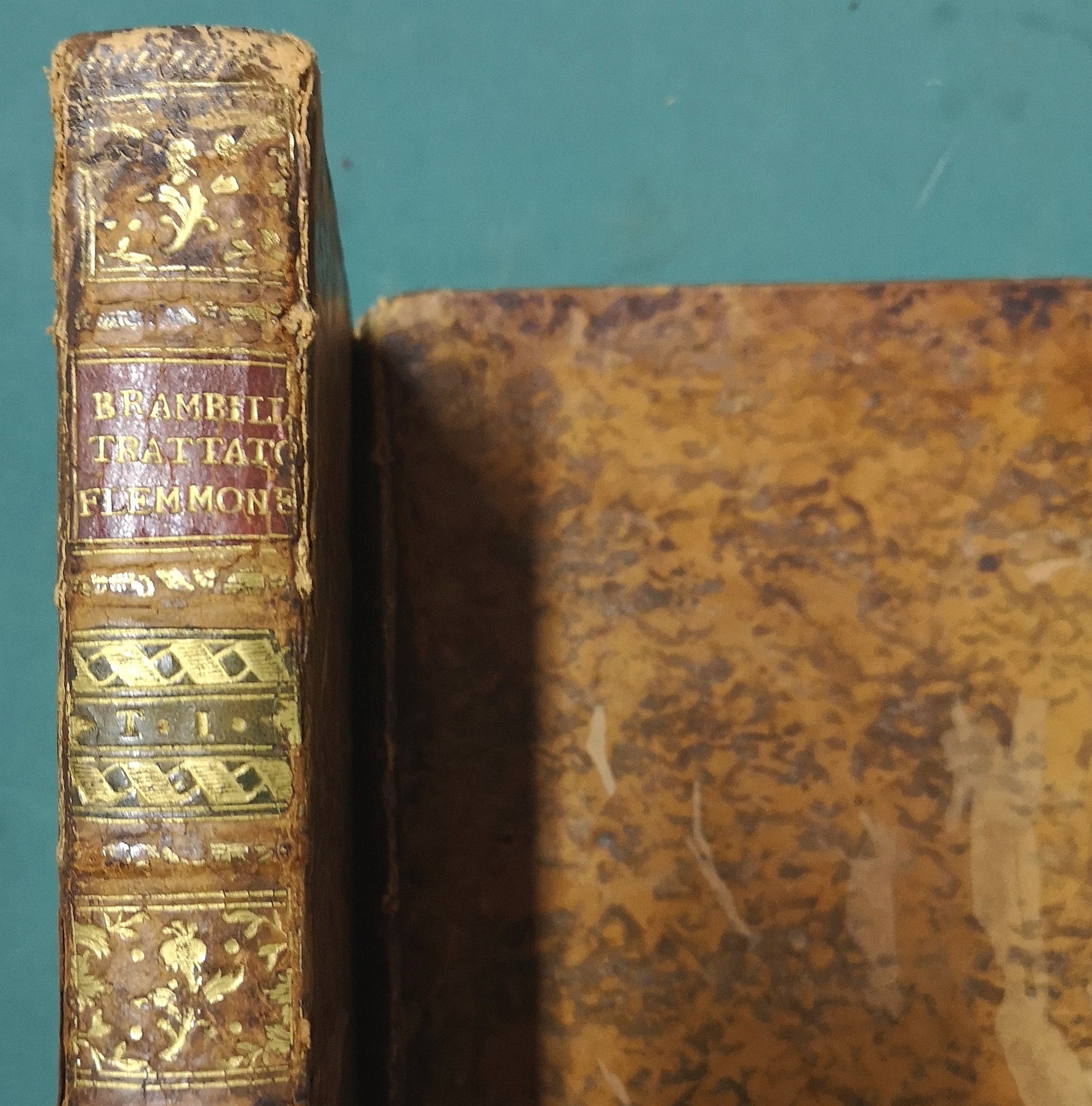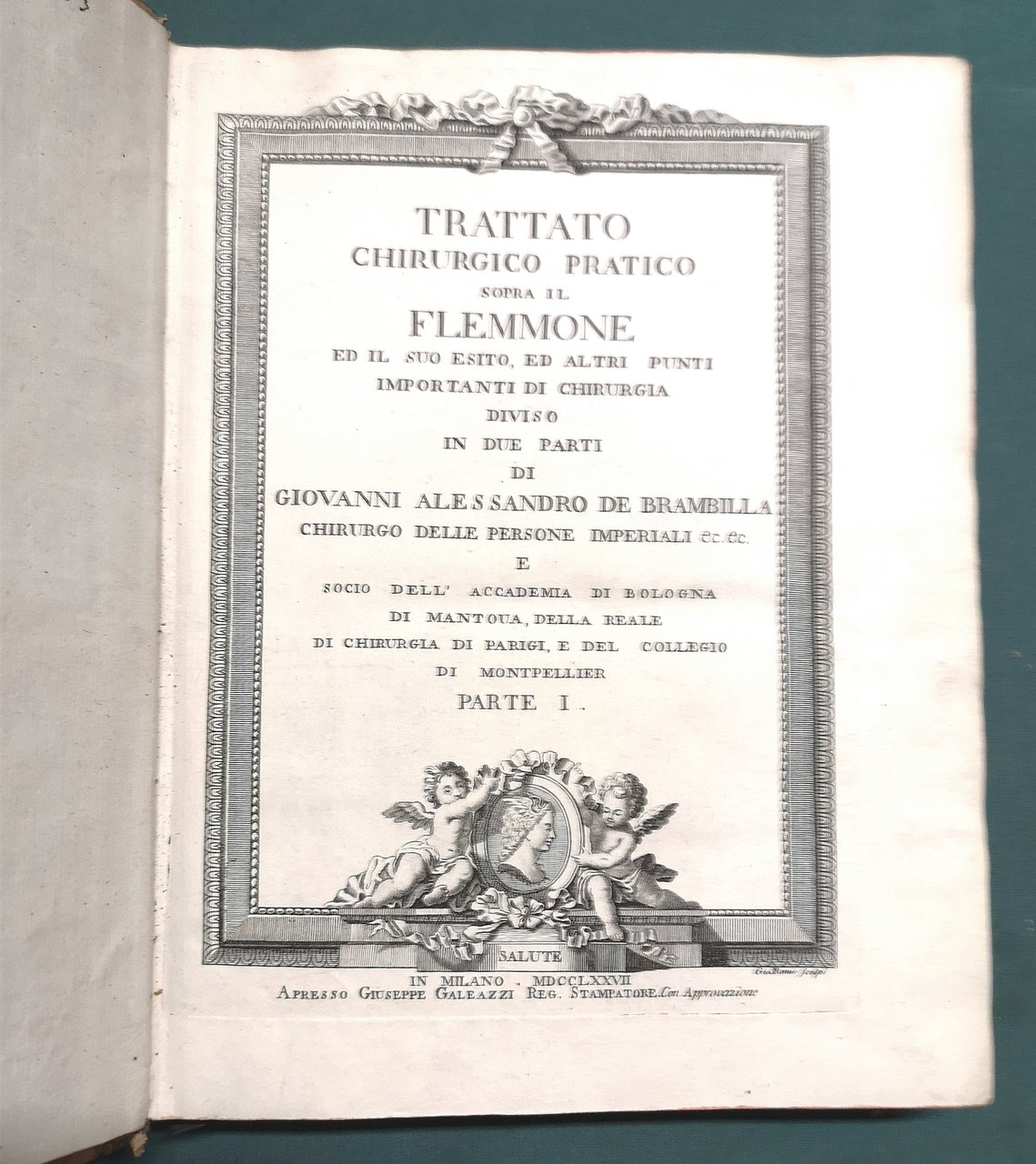 >2 voll. in-4, pp. (8),305,(3); (2),400, (4), frontespizi figurati in calcografia, capilettera e finalini finemente incisi, purtroppo mancante la tavola di ritratto dell'Imperatore Giuseppe II. Bella legatura coeva in piena pelle, titolo in oro su tassello e fregi in oro sul dorso a nervi, dentelles dorate, tagli rossi. Edizione originale. Medico di corte dell'imperatore Giuseppe II, nonché innovatore della didattica chirurgica presso la Josephs Akademie, Brambilla fu inoltre l'ispiratore delle riforme giuseppine riguardanti l'assistenza ospedaliera alle partorienti, all'infanzia e alla vecchiaia; si dedicò all'elaborazione di riforme in campo medico e, in particolare, in ambito chirurgico. La presente opera tratta diffusamente del Flemmone, un'infezione simile all'ascesso purulento o alle necrosi, con osservazioni di molti casi clinici e trattamenti sperimentati. Ottimo esemplare, fresco e marginoso, antichi restauri ai dorsi, qualche screpolatura della pelle. Pazzini, Bio-Bibliografie, n.193; Hirsch, I, 674; Biog. Méd., II, 629.