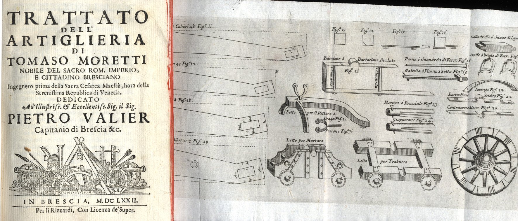 >in-4, pp. (16, ivi comprese 2 tavole numeriche), 56, leg. cartone rustico coevo. Cinque tavole incise e ripiegate ed una in silografia (“Profilo del petardo”) al verso dell'ultima carta. Dedica a Pietro Valier, capitano di Brescia. Seconda edizione molto ampliata e più corretta della prima di Venezia (1665), di cui, infatti, nell'avviso l'A. dice: “mentre io ero in Dalmatia, fu stampato in Venezia senza la debita Correttione”. Molto rara. Il nobile Bresciano Tommaso Moretti, ingegnere della Repubblica di Venezia, è stato uno dei più grandi esperti di arte militare del XVII sec. Bell'esempl. a pieni margini (sugli ultimi 4 ff. abile velatura e risarcimento di parte del testo). Choix 10324. M. Michel-Michel V, 198-9. Riccardi II 186. D'Ayala III 149. STC XVII 594.