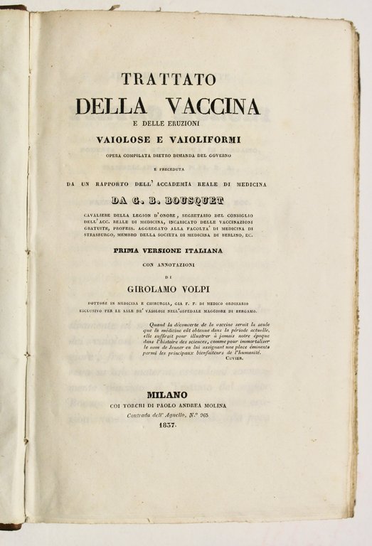 Trattato della vaccina e delle eruzioni vaiolose e vaioliformi opera compilata dietro dimanda del governo e preceduta da un rapporto dell'accademia reale di medicina…con annotazioni di Girolamo Volpi