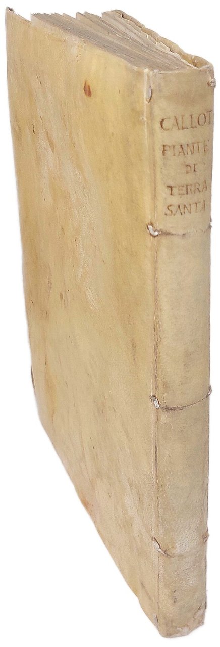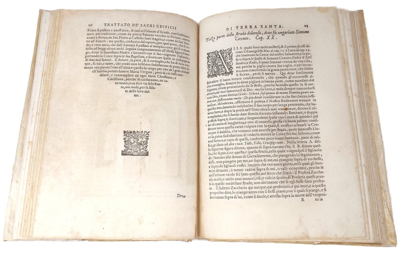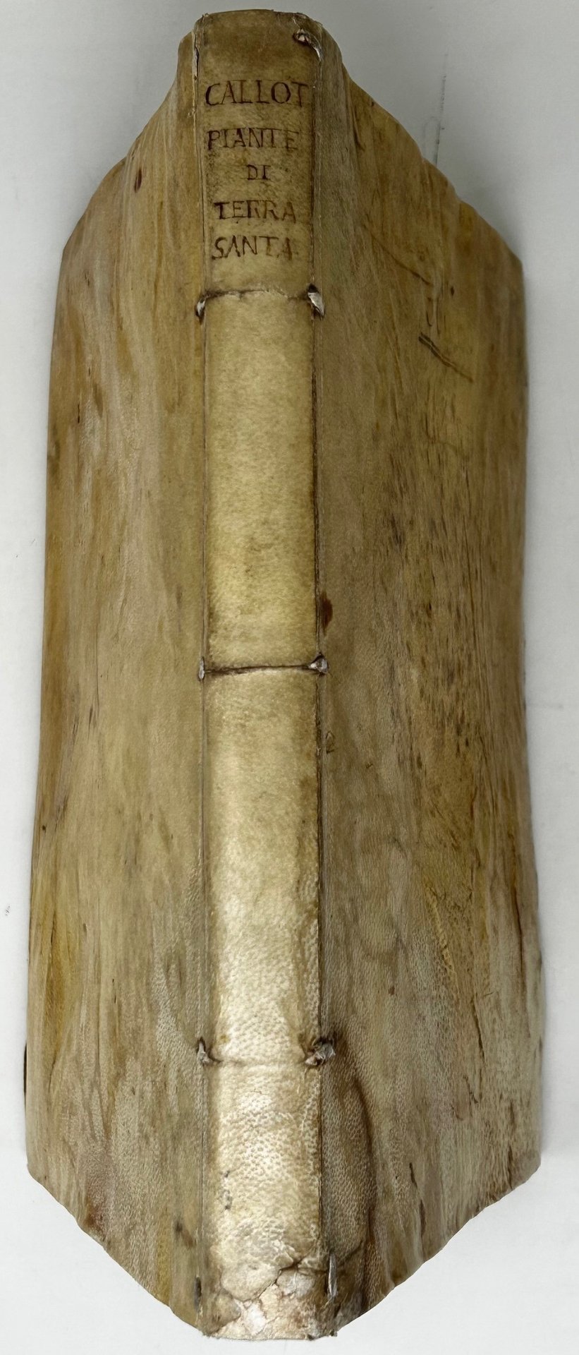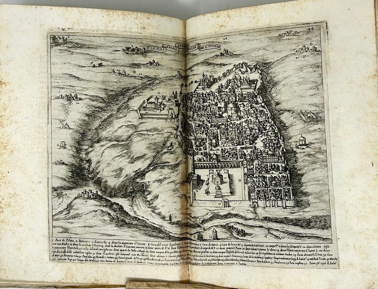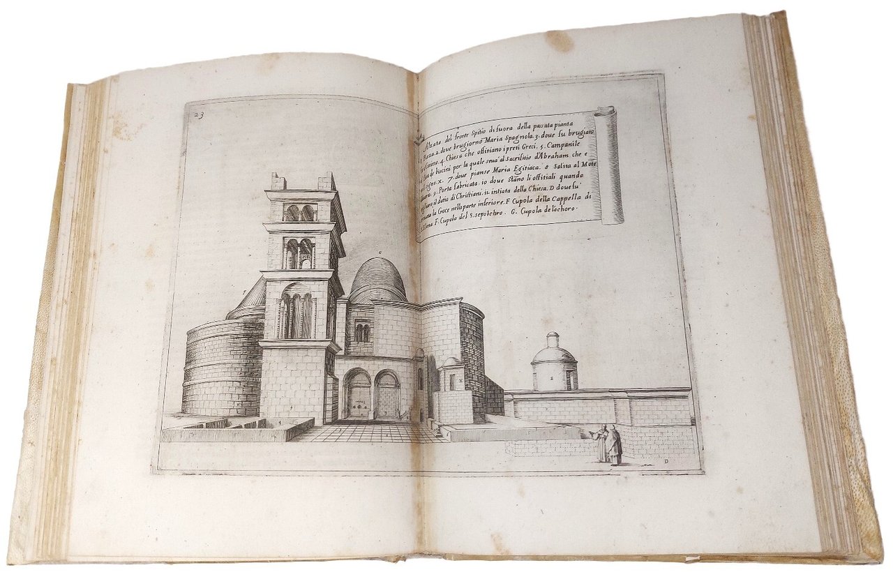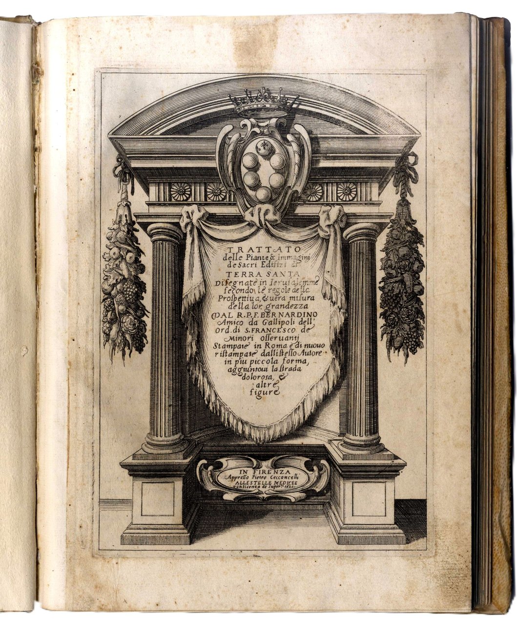 >in-folio piccolo (275x195 mm.), titolo figurato inciso entro bella bordura architettonica con le armi dei Medici, pp. 66 di testo a stampa. Grandi capilettera, testate e finalini, incisi in silografia, emblema delle Stelle Medicee al verso dell'ultima pagina, 46 figure (numerate 1-47 con la tav. 42 omessa, come in tutti gli esemplari) su 39 tavole a piena pagina, incise in rame da Jacques Callot dai disegni di Amico stesso. Legatura coeva piena pergamena rigida, titolo ms. al dorso. Una prima edizione di questa fondamentale attenta descrizione degli edifici di Terra Santa venne pubblicata nel 1610, con i disegni incisi da Antonio Tempesta. La presente, con dedica a Cosimo Secondo, è di notevole pregio essendo adorna dei bellissimi rami del Callot, qui in primo stato (su 2). Bernardino Amico, nativo di Gallipoli, frate minore osservante, viaggiò nei luoghi di Terra Santa negli anni 1593-1597 e pubblicò in quest'opera gli appunti e gli schizzi presi sul luogo. Esemplare genuino in buone condizioni,qualche fioritura e macchie nel margine interno bianco in corrispondenza delle braghette delle tavole, raro. Cicognara 3932. Berlin Kat., 2782. Fowler 1961. Lieure, J.Callot, nn.306-352, I/II. Cat. Vinciana 1321. British Library XVII cent:, I, 29.