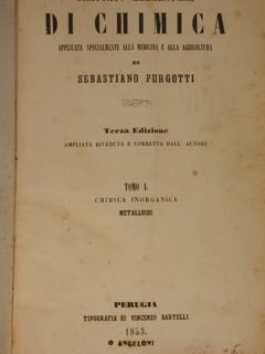 2 voll. in uno ril. in cart. con dorso in pelle., cm 23,5x15,5. Tomo I: Chimica inorganica - Metalloidi, pp 440. Tomo II: Chimica inorganica - Metalli, pp. 504. Leggere tracce d'uso.