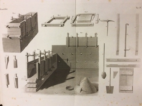 In-4 p. (mm. 310x230), 5 volumi (in 7 tomi) + 1 dedicato alle sue Opere, mz. pelle coeva, fregi e titolo oro al dorso. L'importante trattato dell'"Arte di edificare", diviso in dieci libri che affrontano pressochè tutti gli aspetti della tecnica edilizia, è illustrato da complessive "234 tavole inc. in rame", cosi' composte: 211 numer. da I a CCVII con 4 "bis" + 23 contrassegnate dalla lettera A alla Y, dettagliatamente descritte.<br>L'opera, molto accurata, analizza approfonditamente: I materiali edili in tutti i loro aspetti e comportamenti nelle differenti condizioni di impiego - La stereotomia (con cenni storici sull'utilizzo delle pietre da taglio) - Le tecniche murarie - L'impiego del legname (sia come elemento portante della costruzione che decorativo per le rifiniture interne ed esterne) - Le costruzioni in ferro (con una interessante sezione dedicata ai ponti in ferro a vista) - I diversi metodi di copertura degli edifici e la teoria delle costruzioni.Cfr. Cicognara,634 che cita l'ediz. francese: "Opera assai ben concepita ed eseguita, con vastità di cognizioni in ognuno dei rami relativi all'Architettura.. è forse la più ampia che abbracci tutte le utili pratiche per l'arte edificatoria" - Brunet,IV,1373: "La première édition de cet ouvrage capital a été publiée à Paris de 1802 à 1817". Il VI volume (mm. 302x202), con legat. diversa, porta il titolo: "Opere", con note e giunte importantissime, Mantova, Fratelli Negretti, 1840, pp. 251. Vi sono contenute: Memoria su la Marineria degli antichi e sui Navigli a parecchi ordini di remi - Descrizione dei principali acquidotti. In Appendice al Commentario di S. Frontino su gli Acquidotti di Roma - Leggi o costituzioni imperiali intorno agli Acquidotti, tanto dell'antica Roma quanto della nuova cioè di Costantinopoli: "mancano le relative 29 tavole" - Saggio storico sul Ponte di Rialto in Venezia: con 1 tav. in tinta che lo raffigura. Con qualche lieve fiorit., altrimenti esemplare con barbe, ben conservato.
