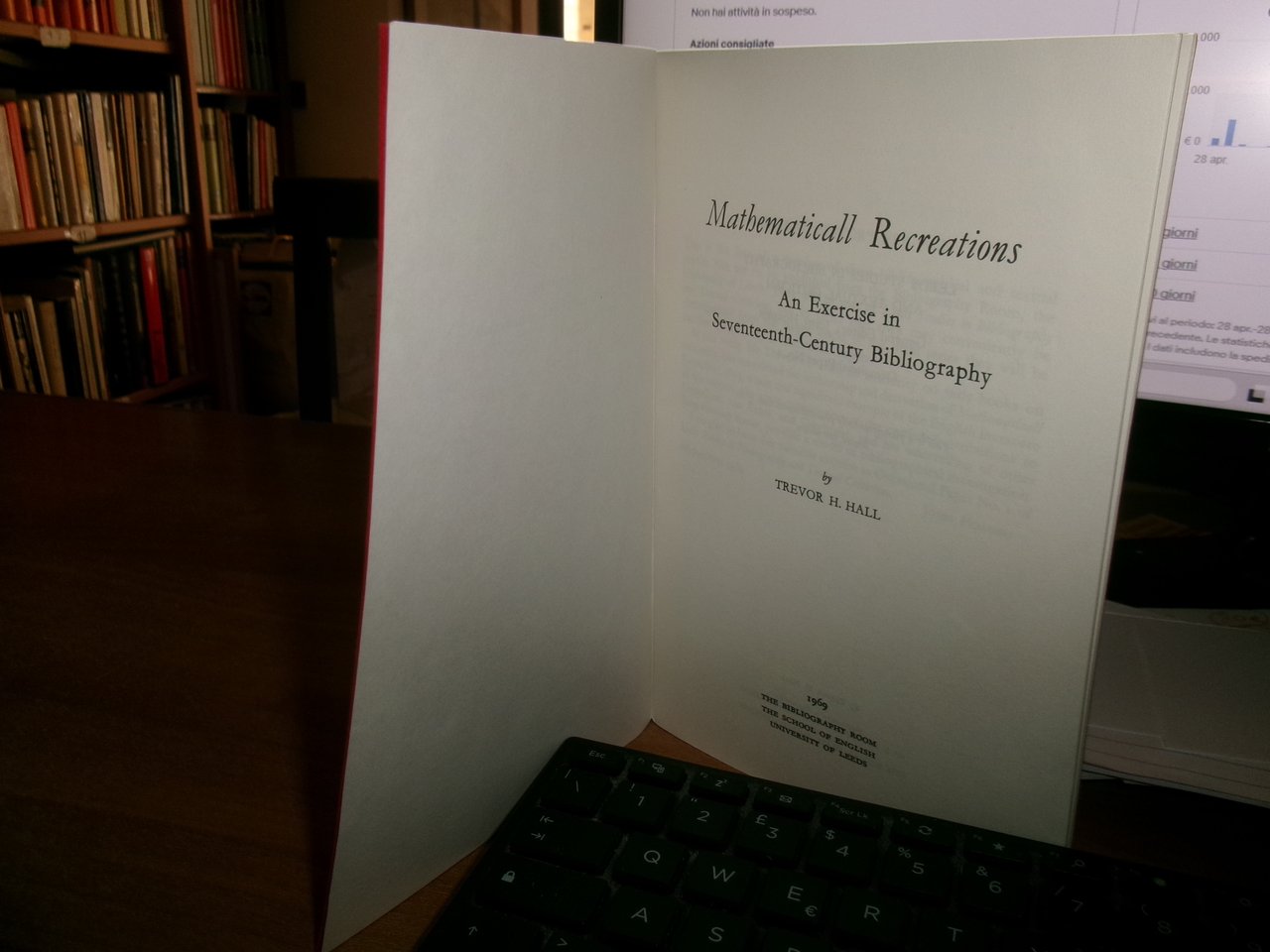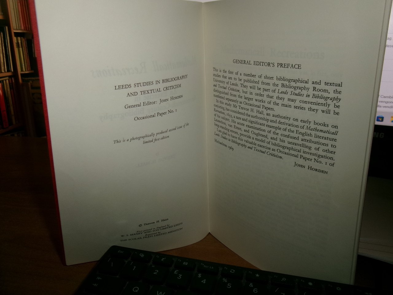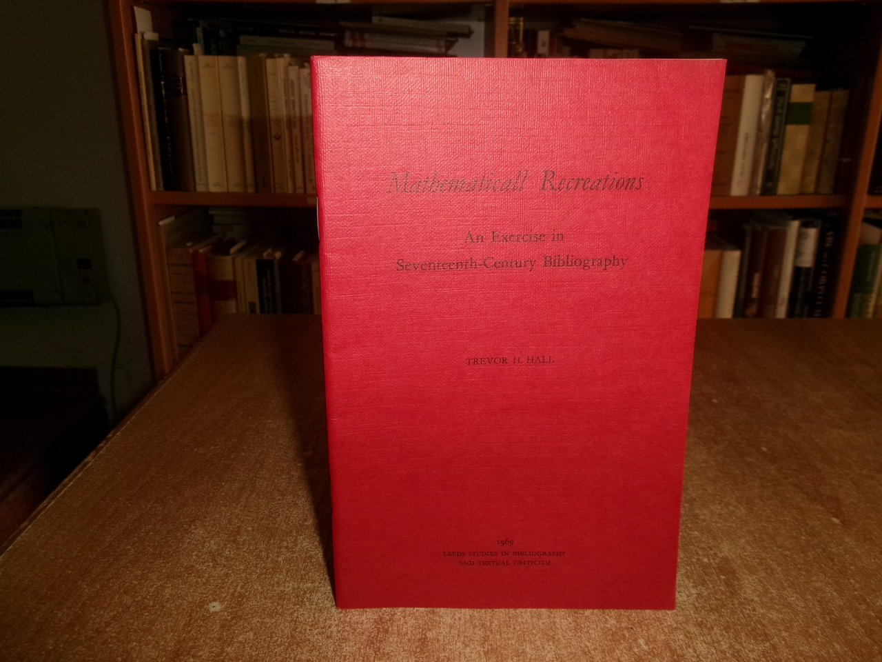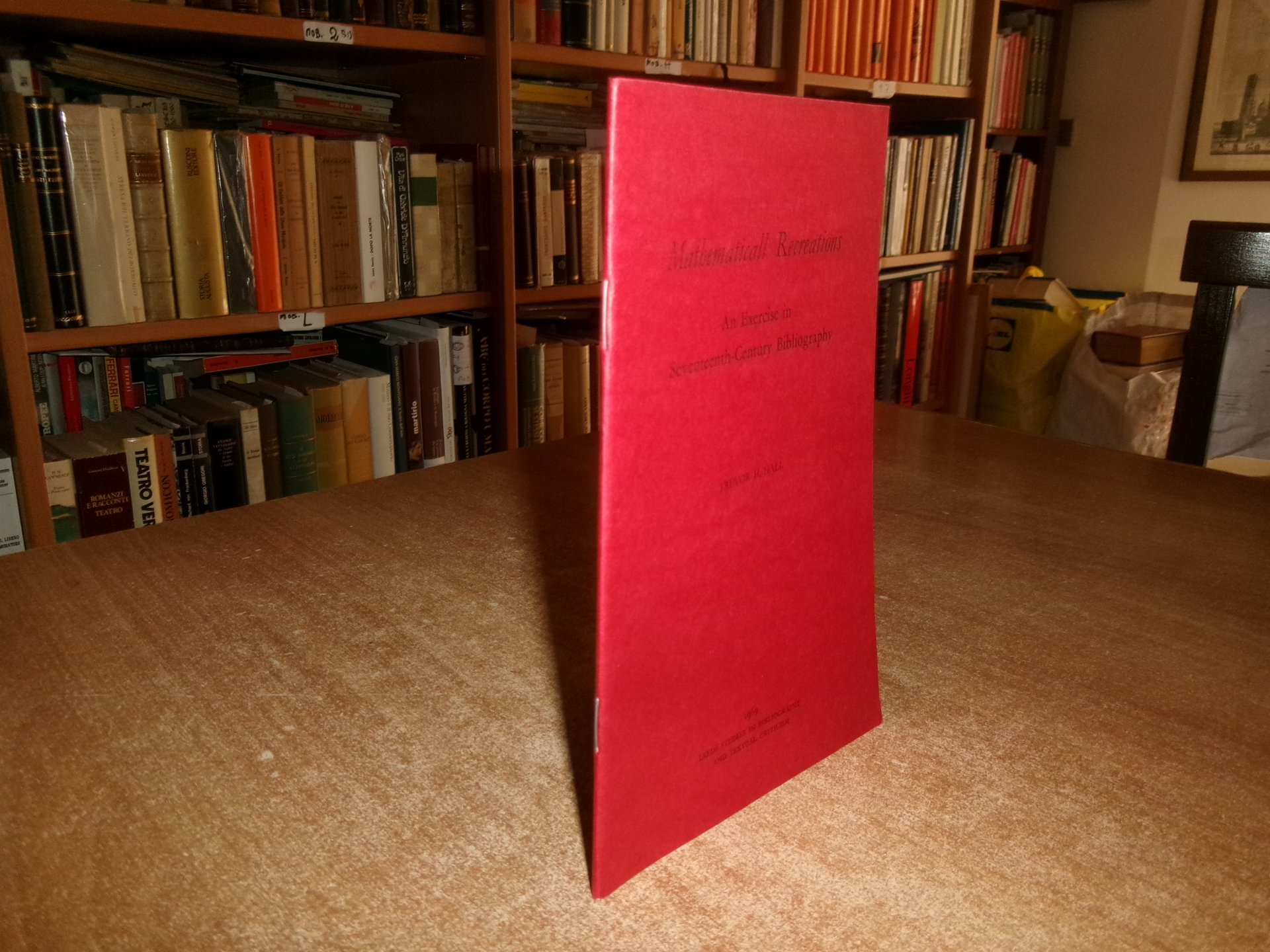 TREVOR H. HALL. Mathematicall Recreations An Exercise in Seventeenth-Century Bibliography. University of Leeds, 1969. In-8°, br. edit. con 2 punti metallici. 38 pp. Opuscolo come nuovo con testo in inglese. Uff. A - II - 3 - 2