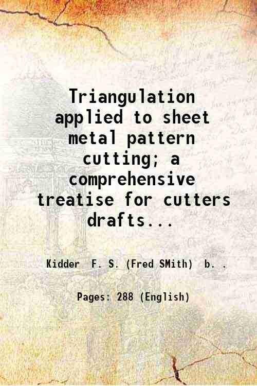 Triangulation applied to sheet metal pattern cutting; a comprehensive treatise for cutters draftsmen foremen and students; progressing from the simplest phases of the subject to the most complex problems employed in the development of sheet metal patterns; with practical solutions of numerous problems of frequent occurrence in sheet metal shops. By F.S. Kidder. Illustrated by means of 124 engravings in line and half-tone including many reproductions of photographs of sheet metal models made expressly for this work. 1917