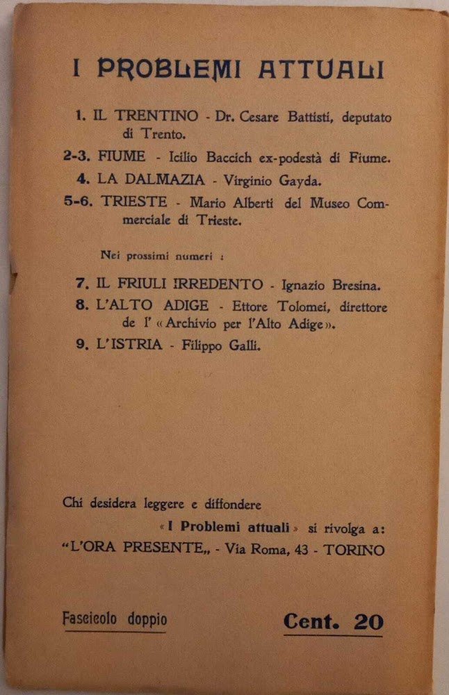 Trieste "ciò che avrebbe significato per l'Italia la rinuncia aTrieste. Anno I, N 5-6 15 febbraio 1915 - I problemi attuali - Pubblicazione quindicinale. Fascicolo doppio. Il fascicolo presenta piccoli tagli e ingiallimenti, interno in buonissimo stato. 35 Buono (Good) .