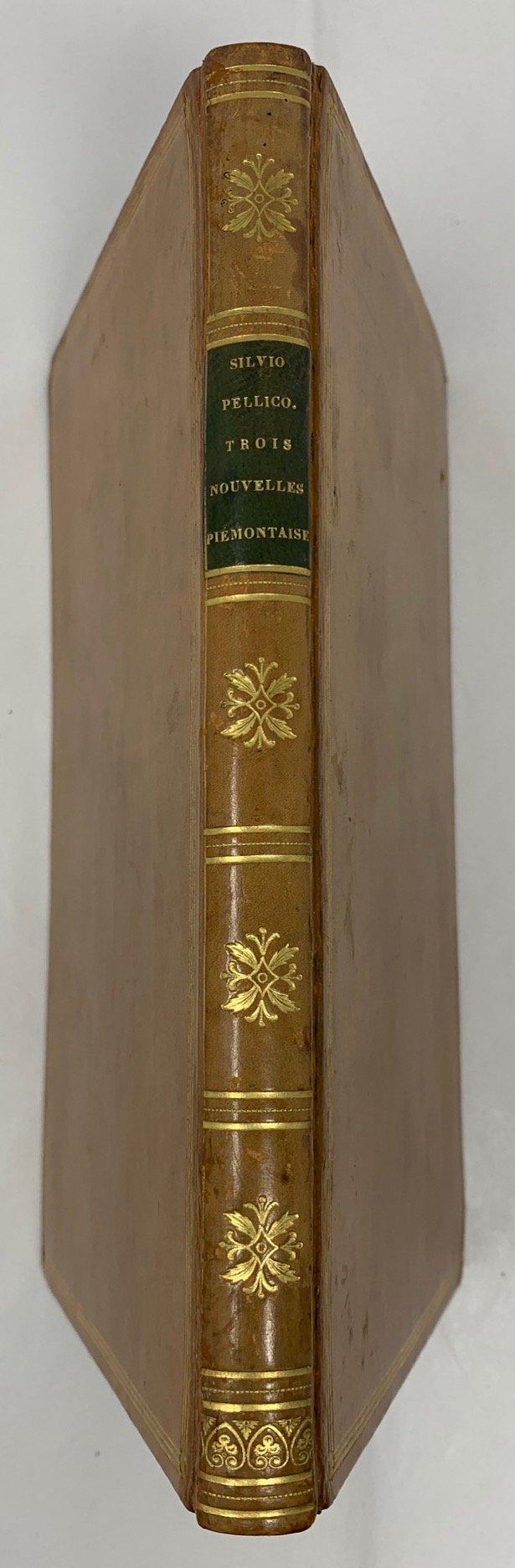 >in-8 (206x122 mm), pp. (8, le prime 2 bianche), 227, (3), legatura del tempo p. vitello biondo, bordura a filetti oro sui piatti, tass. in pelle con tit. e fregi oro al dorso (cerniere deboli). Con alcune testatine, iniziali e finaletti silogr. Prima edizione francese (fatta a beneficio dell'Ospedale dei pazzi di Torino) delle seguenti tre novelle: ''Eugilde dalal Roccia'' di Pellico (pubblicata per la prima volta nel 1834, cfr. Parenti n. 140) e ''Imilda'' di C. Balbo; la ''Soeur Marguerite'' è del ''francese M. de Barante il quale, trovandosi a Torino, volle partecipare alla beneficenza'' (cfr. Parenti). Buon esemplare, fresco salvo sporadiche e lievi macchioline su alcuni fogli. Parenti, Bibliogr. Pellico, n. 175.