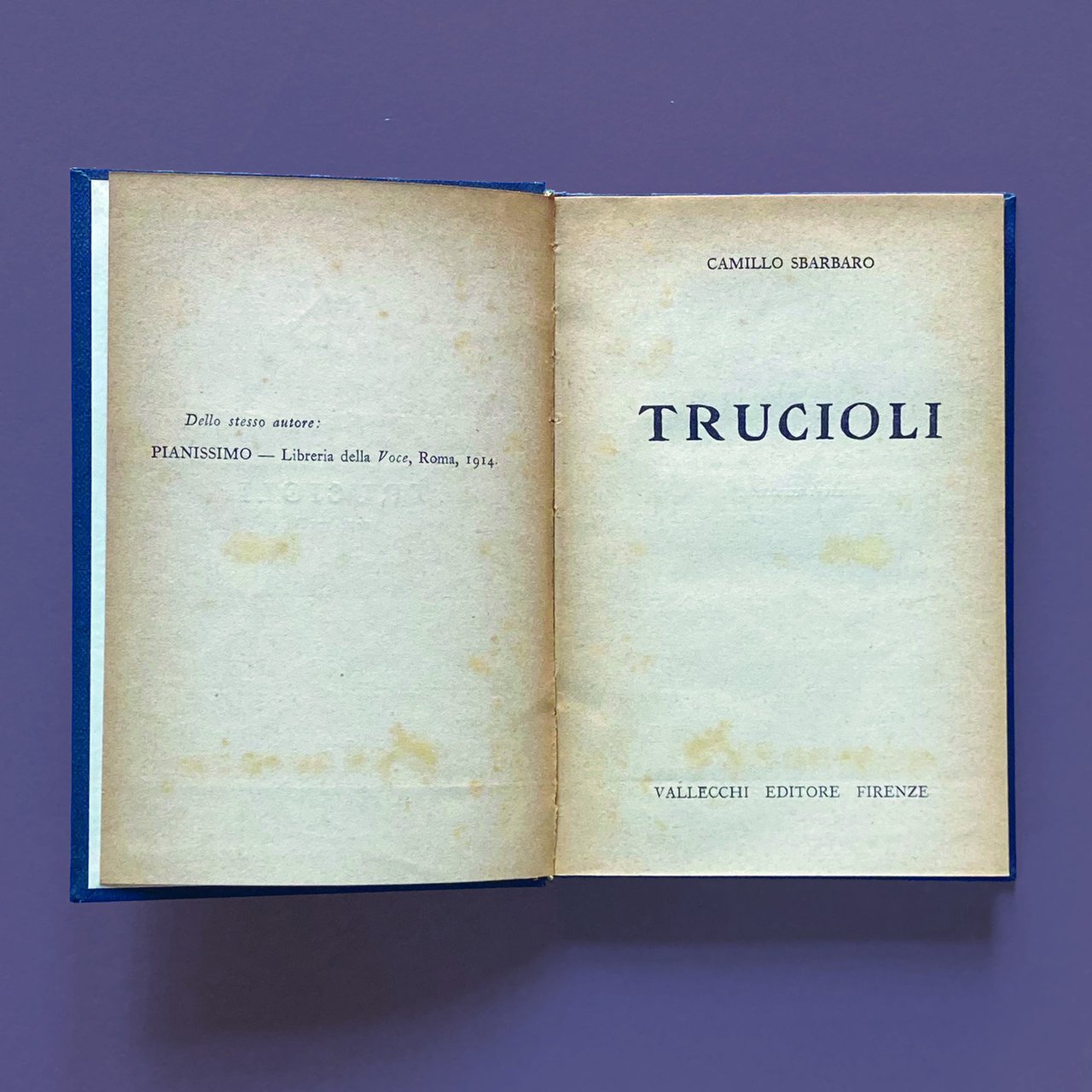 16°, pp. 208, (invece di 210), legatura in tela novecentesca. Comprende 80 trucioli apparsi su periodici e 6 inediti. L'originale uscì nel 1914 in numero limitatissimo di copie, in forma dattiloscritta. Mancano le pagine 209 e 210. Esemplare da studio, ma ben conservato.