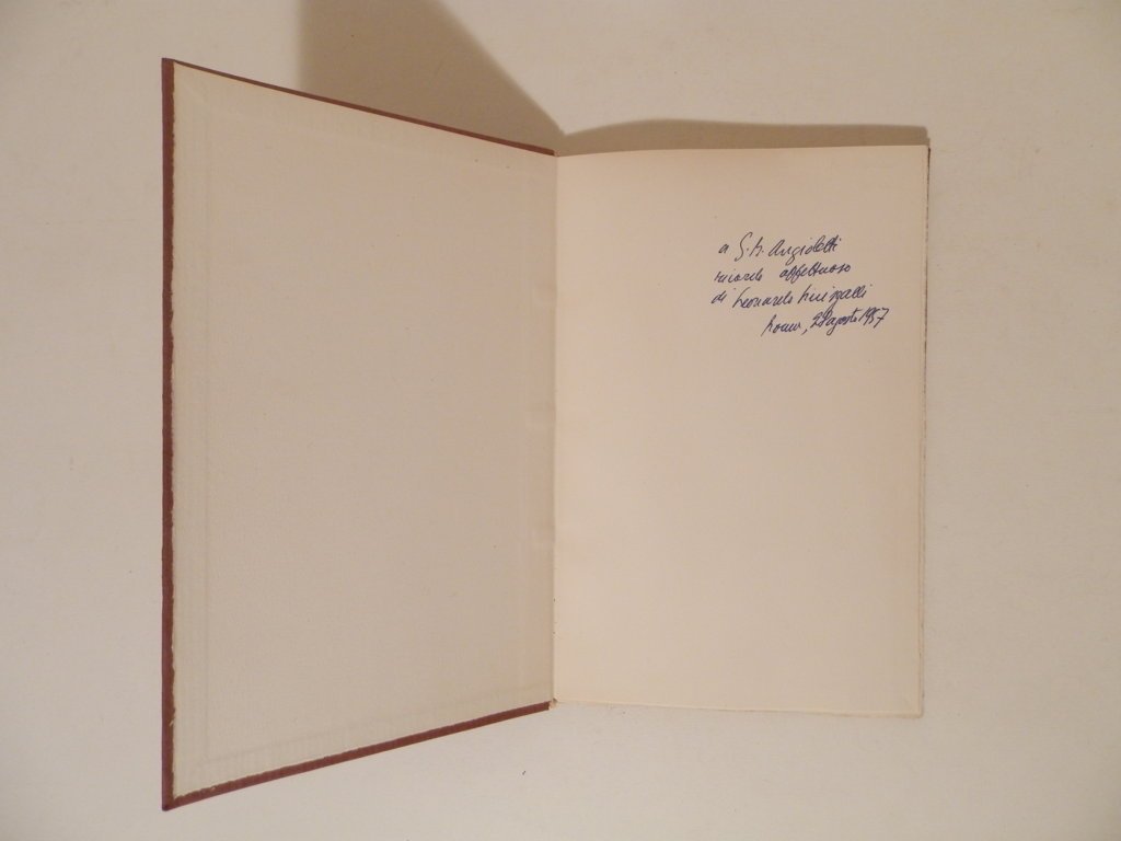 In-8°, legatura in tela editoriale con titoli in oro al dorso. Esemplare con dedica dell'autore. Prima edizione stampata a mano da Franco Riva col suo torchio su carta di Pescia dei Fratelli Magnani in 130 esemplari numerati con numeri arabi. Copia n. 93. Raccolta di poesie di Sinisgalli divisa in due parti. 13 poesie nella prima con titolo "Tu sarai Poeta". 8 poesie nella seconda con titolo "piccoli viaggi". Seguono "Due canzonette" e una "Postilla dell'autore" che ringrazia Riva "d'aver consentito a un mio tic tipografico separando visibilmente le due parti della raccolta, la preistoria e la cronaca". Leonardo Sinisgalli è stato un personaggio veramente eclettico. Laureato in ingegneria elettrotecnica non ha mai tralasciato l'attività letteraria occupandosi anche di pittura, architettura, grafica e pubblicità. Ha diretto l'ufficio pubblicità della Olivetti, ha collaborato con la RAI, è stato direttore della rivista Pirelli, ha fondato e diretto la rivista "Civiltà delle macchine" ed è stato responsabile dei servizi pubblicitari dell'ENI di Enrico Mattei. La sua poesia è spontanea, immediata, frutto della prima ispirazione poetica "che non sopporta la violenza di macchinose manipolazioni" come lui ha sostenuto in un suo scritto. Il volume ha nella prima pagina bianca una sua affettuosa dedica a penna datata 28 agosto 1957 a Giovanni Battista Angioletti che aveva un ruolo primario nel panorama letterario italiano e rapporti con importanti scrittori tra cui Giuseppe Ungaretti, Luigi Pirandello, Thomas Mann, Paul Valery e James Joyce. Ottimo esemplare, senza custodia. *** TUTTI I NOSTRI LIBRI SONO VISIBILI PREVIO CONTATTO MAIL O TELEFONO NELLA NUOVA SEDE DI MILANO: LIBRERIA COSMOPOLIS, VIA JOMMELLI, 22. ***