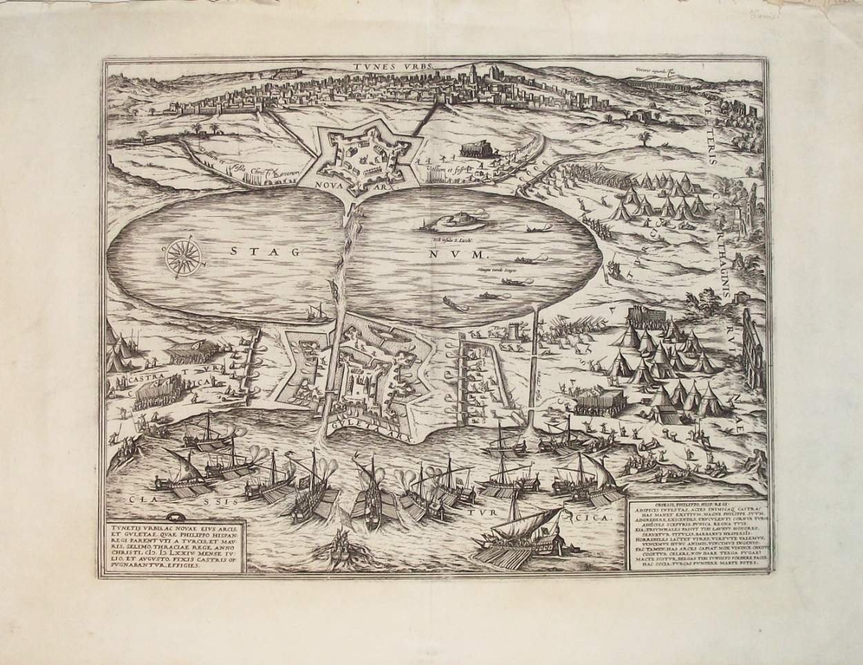 >Incisione all'acquaforte su doppia pagina (mm320x420 più ampi margini bianchi), in bianco e nero. L'opera costituì il primo atlante organico al mondo, con 303 planimetrie e vedute di città di Europa, Africa e Asia nel XVI secolo, ornate da stemmi ed animate da personaggi. Tiratura originale. Cfr. Koeman, Atlantes Neerlandici, vol. II, pp.10-25, B.-H.