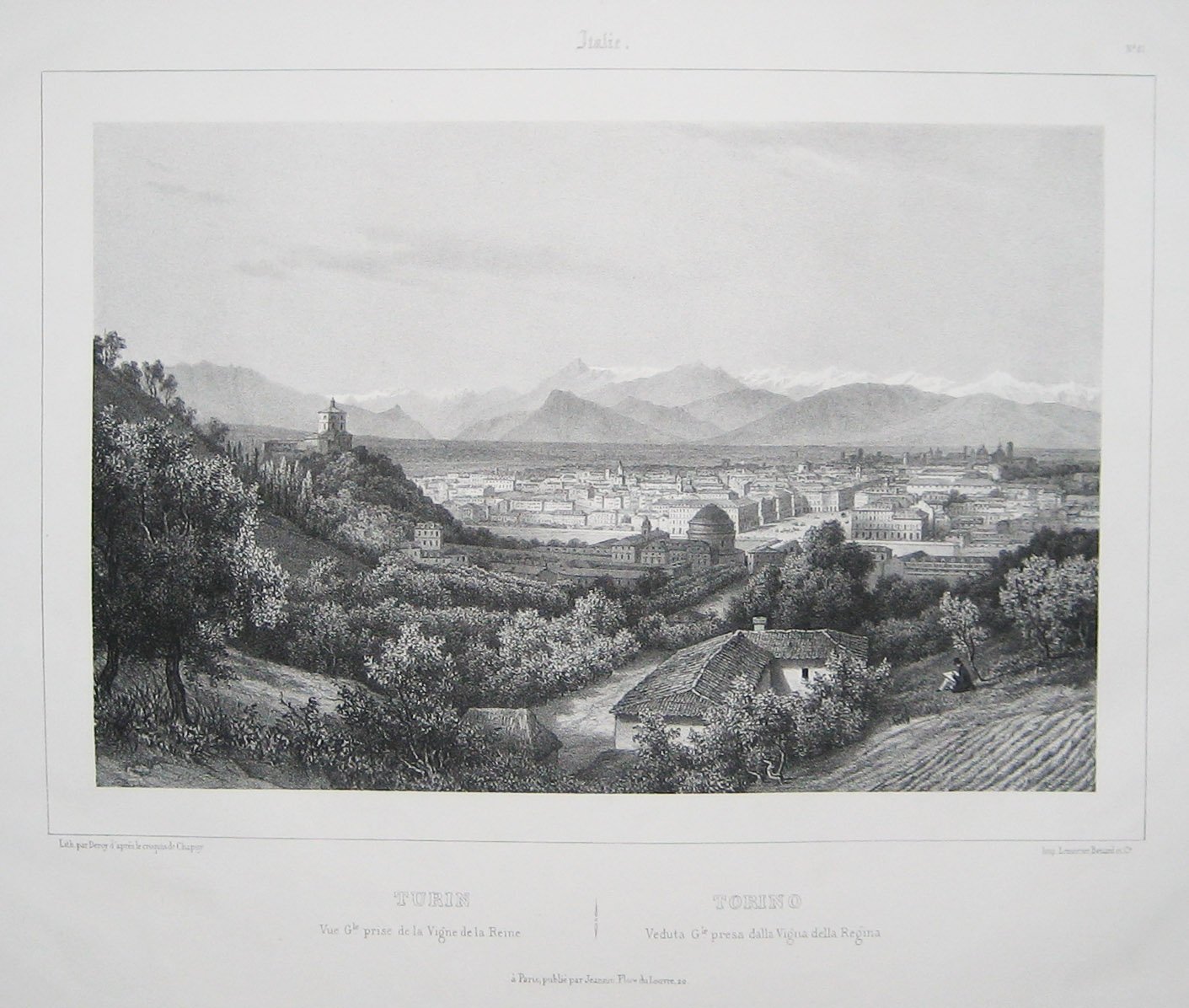 >Litografia originale (cm 30x42 compresi i margini bianchi), titolo in francese ed italiano al centro del margine inferiore. Sopra e sotto il titolo, i nomi degli artisti e le note tipografiche, al centro del margine superiore bianco la scritta ''Italie''. Litografia firmata di Auguste Deroy su disegno di Nicolas-Marie-Joseph Chapuy tratta dalla raccolta ''L'Italie monumentale et pittoresque''. Veduta prospettica della città presa dalla Vigna della Regina. E' uguale a quella litografata da Enrico Gonin nel 1852 su disegno dello stesso Chapuy. Peyrot, Torino nei secoli, 482-1.