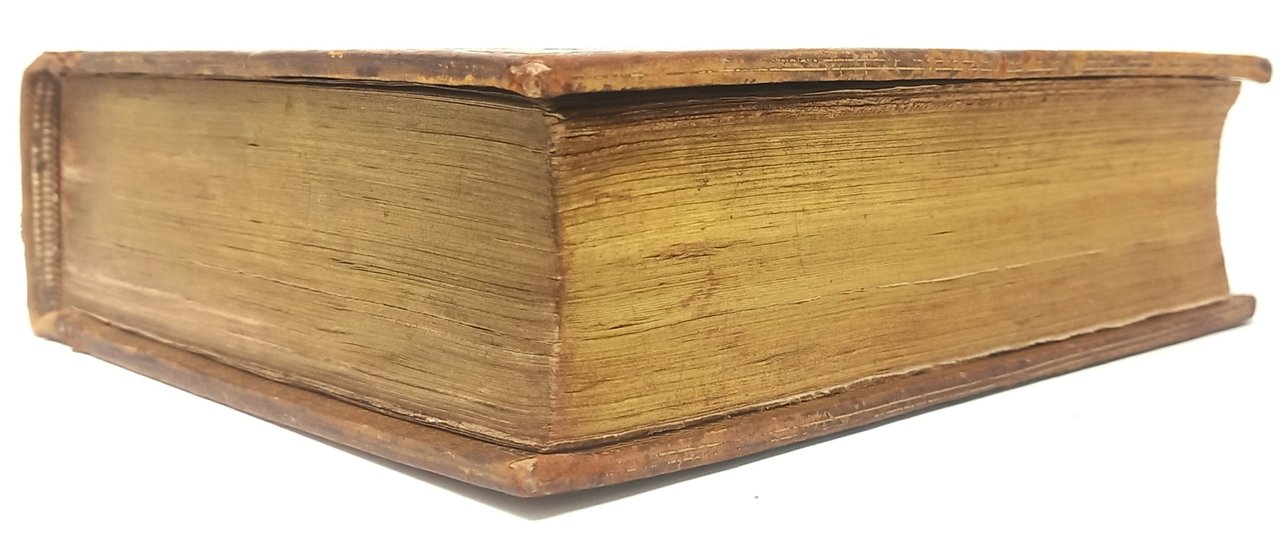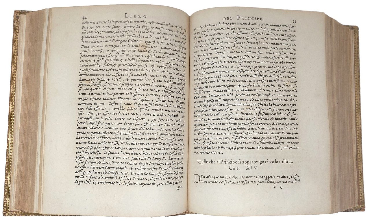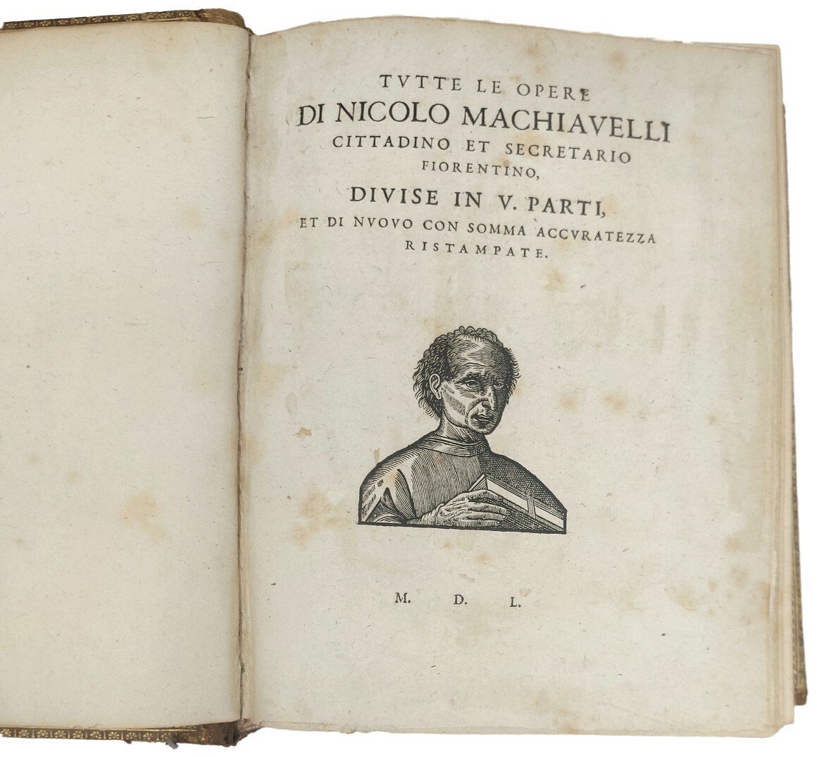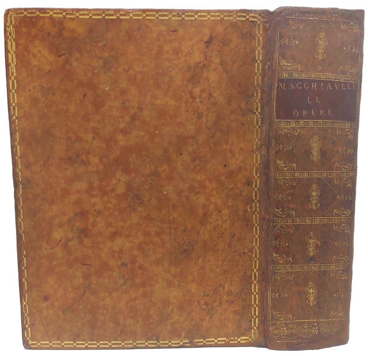 >in-4 (mm 220x273), 5 parti in un volume, pp. 8, 320; (16), 280; (4), 106, (2 bianche); 152; 158; legatura settecesca in piena pelle bazzana, titolo e fregi oro al dorso, tagli dorati, restauri alle cerniere ed alla cuffia inferiore. Bella cornice ai piatti, dentelle all'unghia, cerniere e cuffia inferiore restaurate. Terza tiratura della famosa edizione detta "della testina", in riferimento al ritratto dell'autore inciso in legno che compare sui fogli di titolo delle cinque parti (Le Historie Fiorentine - Il Principe - Discorsi sopra la prima deca di Tito Livio - Arte della Guerra - L'Asino d'oro, la Mandragola e la Clizia). Estremamente interessante dal punto di vista editoriale, sono note 5 tirature, descritte minuziosamente per la prima volta da Gamba e differenti per formato, carattere tipografico ed impaginazione. Egli non fece però congetture sul luogo di stampa e sulla data "1550", messa seriamente in discussione da Adolf Gerber e dai bibliografi che dopo di lui esaminarono la questione, concordando tutti nel giudicare sia la prima edizione della T. sia le sue quattro ristampe un prodotto della tipografia ginevrina del XVII secolo. Controverso è anche il rapporto che intercorre tra la prima edizione, collocata con certezza in una data posteriore al 1588 e, congetturalmente, tra il 1610 e il 1619, e le quattro ristampe, datate tra il 1628 e il 1670 (Bertelli, Innocenti). La falsa data del 1550 non fu una scelta casuale: essa è infatti anteriore alla messa all'Indice delle opere di Machiavelli (1557 e 1559) e all'uscita delle Enarrationes (1552) del potente cardinale Ambrogio Catarino , in cui scagliandosi contro il M. vide un nesso tra machiavellismo ed eresia. Il ritratto della testina "mostra un busto di tre quarti di un uomo che sorregge con una mano un grosso volume e punta sull'osservatore uno sguardo gelido e penetrante, privo di ogni ironia e non addolcito da alcun sorriso [...] una vera e propria metafora visiva della spregiudicata mancanza di scrupoli dell'empio segretario fiorentino, se non della sua malvagità, della sua corruzione morale, della sua empietà". La xilografia era stata già utilizzata nell'edizione in quattro volumi delle opere di M. uscita a Venezia tra il 1540 e il 1541 presso Comin da Trino; fu poi ripresa da Francesco Marcolini per il primo libro dei Mondi di Anton Francesco Doni e, successivamente, da Lazar Zetzner per la traduzione latina delle Istorie fiorentine uscita a Strasburgo nel 1610. La scelta di questo ritratto è stata collegata al clima di nascente antimachiavellismo, anche se in effetti non ritrae M. bensì Fino Fini (1431-1519), da un dipinto attribuito al ferrarese Benvenuto Tisi detto il Garofalo (Firpo 2012). Buon esemplare con usuali arrossature della carta, ex-libris alla controsguardia anteriore. Gamba 623: ''cinque diversi esemplari si conoscono...e che male si appose il Prof. Angelo Ridolfi...ridurre a tre e non a cinque, le varie edizioni''.. Bertelli-Innocenti, nn.203-205; 1979, pp. LXIII, 78-80. Gerber 1906; Gerber 1907; Gerber 1912-1913, 2° vol., pp. 92-105. Firpo 2012.