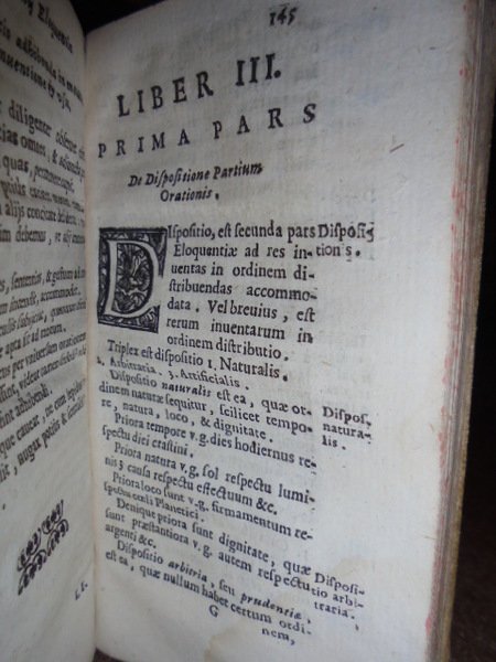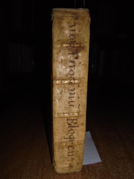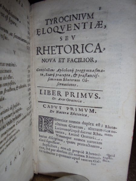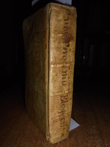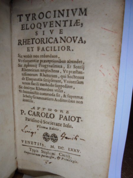 P. Carolo, Paiot. Venetiis, Typis Stephani Curtij, 1675. TYROCINIUM eloquentiae sive rhetorica nova, et facilior. In-16°, (14,5 x 8), pergamena coeva con titolo sul dorso. 1 f. bianco, 6, (18), 432 pp. l' ultimo f. bianco presenta uno strappo. Ottimo esemplare. Raro. Neg. mass. mob. H - H