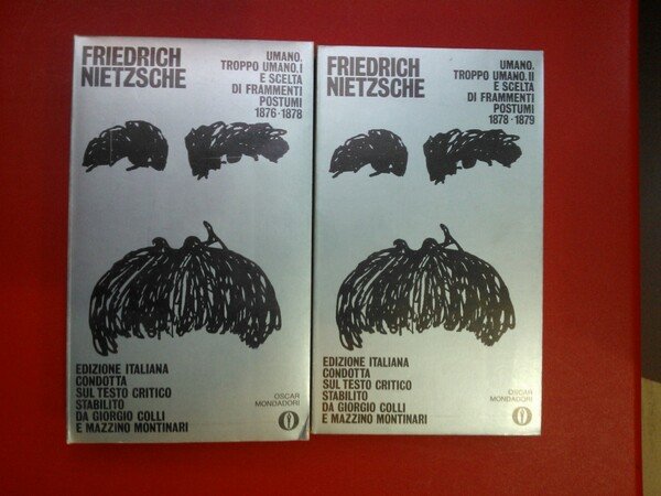 Mondadori 1970, I ed. coll. Oscar, due volumi in brossura e cofanetto ugualmente ill., pp. 388+312, a cura di Giorgio Colli e Mazzino Montinari, trad. di Sossio Giammetta e M. Montinari. I due volumi sono in condizioni molto buone.