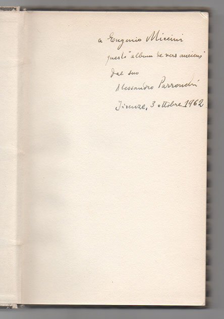 LIBROSeconda edizione aumentata.CON AUTOGRAFO.Ottimo esemplare, pregiato da dedica autografa dell’autore «a Eugenio Miccini / questo ‘album de vers anciens’ dal suo / Alessandro Parronchi / Firenze, 3 ottobre 1962».Stampata su carta Formosa delle Cartiere Miliani in Fabriano in 300 copie numerate a macchina. Raccolta di poesie.