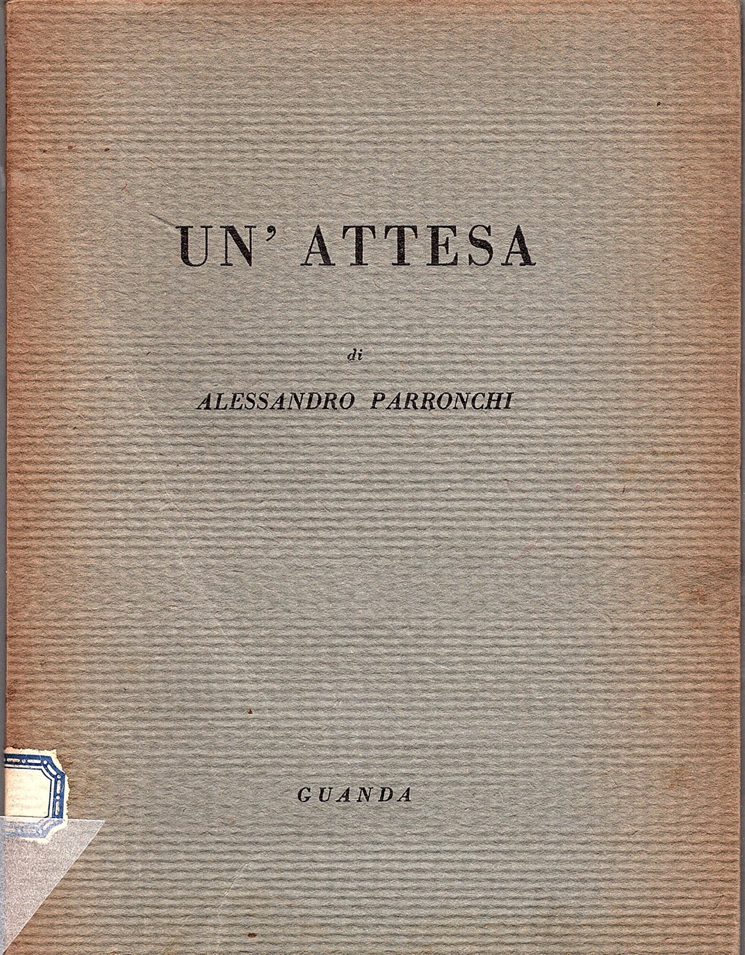 In-16° (17 x 13 cm), pp.78 (2), brossura editoriale grigia ad alette paratestuali. Titoli in nero su fondo grigio. Periferico deperimento cromatico della brossura con ingiallimento, un'etichetta al dorso. Buon esemplare in velina. Prima edizione per la collana 'Falena'(n.5) di questa raccolta poetica di A. Parronchi che va dal 1943 al 1948: '.aspettare è stata condizione comune a molti in questo periodo che va dai momenti più critici della guerra a ieri.'