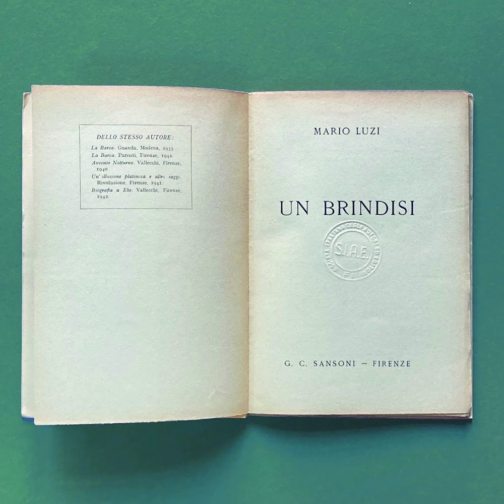 16°, pp. (4), 68, brossura riquadrata a due colori, con risvolti. Poesie scritte tra il 1940 e il 1944. All'angolo del piatto posteriore una macchia in corrispondenza della pecetta con il prezzo che è stata rimossa, altrimenti esemplare perfetto.